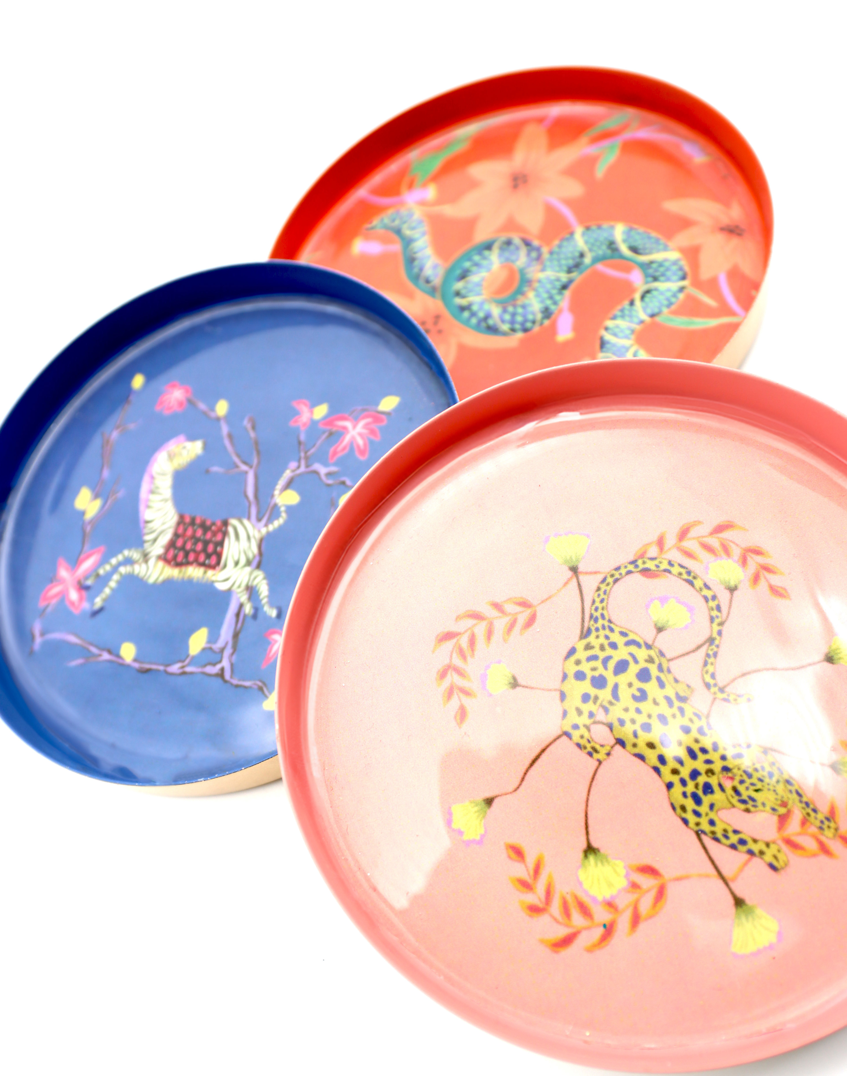 Die Tellerchen zeichnen sich durch ein kunstvolles Design im Asiastil aus, das animalische Motive wie Schlange, Zebra und Leopard aufgreift. Die intensiven Farbkontraste aus Rot und Blau betonen die außergewöhnlichen Designs dieser dekorativen Teller. Mit dieser einzigartigen Farbpalette lassen sich die Tellerchen sowohl in modernen als auch in klassischen Einrichtungsstilen wunderbar integrieren.