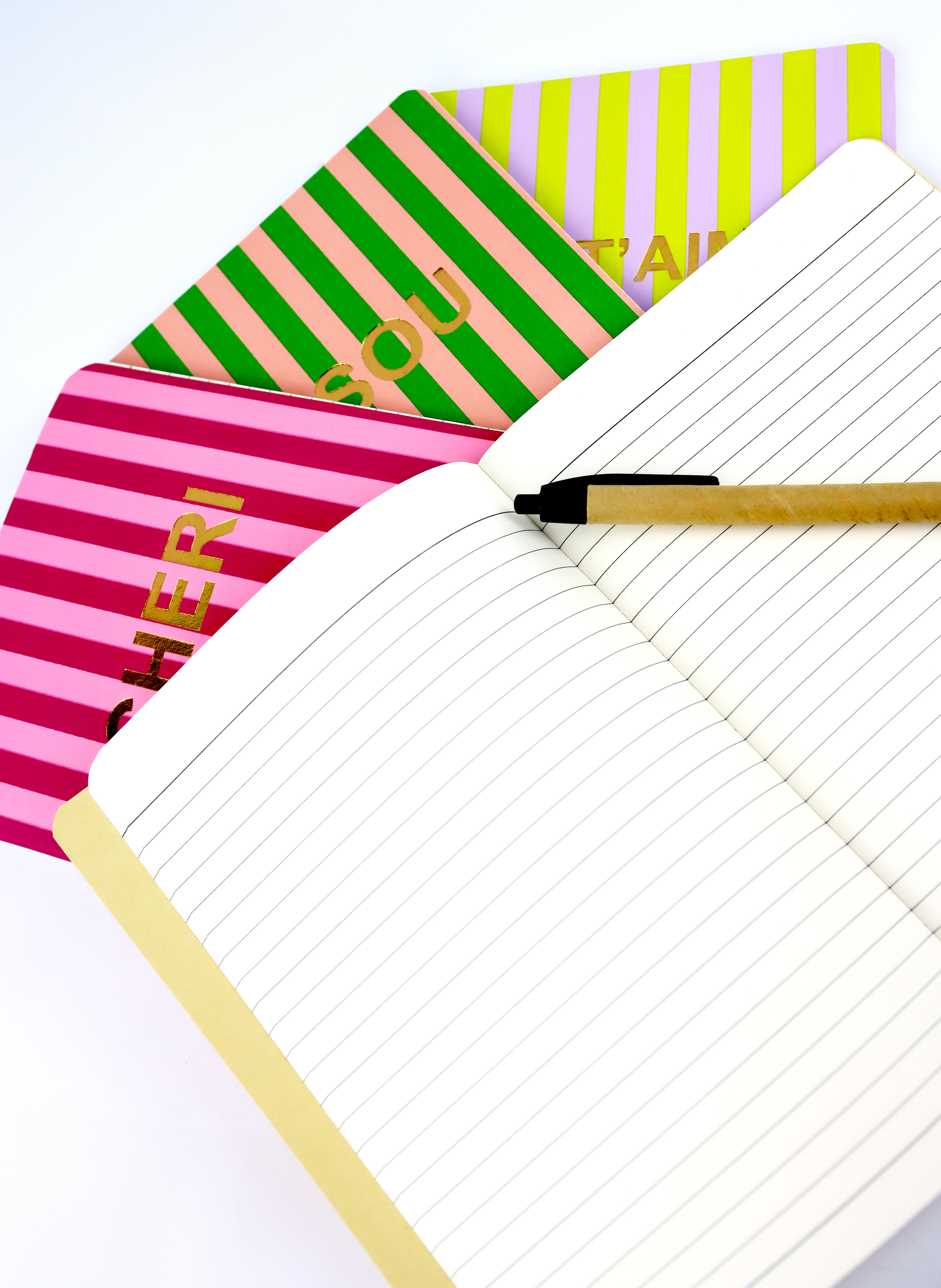 Gestalten Sie das Einkaufserlebnis Ihrer Kunden mit unserem stilvollen Notizheft-Set "Carnet", das speziell für den stationären Einzelhandel im Bereich Wohnen und Lifestyle entwickelt wurde. Artikelnummer: 6748. Dieses vierteilige Set besteht aus Notizheften in trendigen Streifenmustern in den Farben Orange, Rosa, Gelb und Grün. Die Hefte sind aus hochwertigem Papier gefertigt und bieten mit einer Größe von etwa 21 cm ideale Voraussetzungen für kreative Ideen, Notizen oder Planungen.