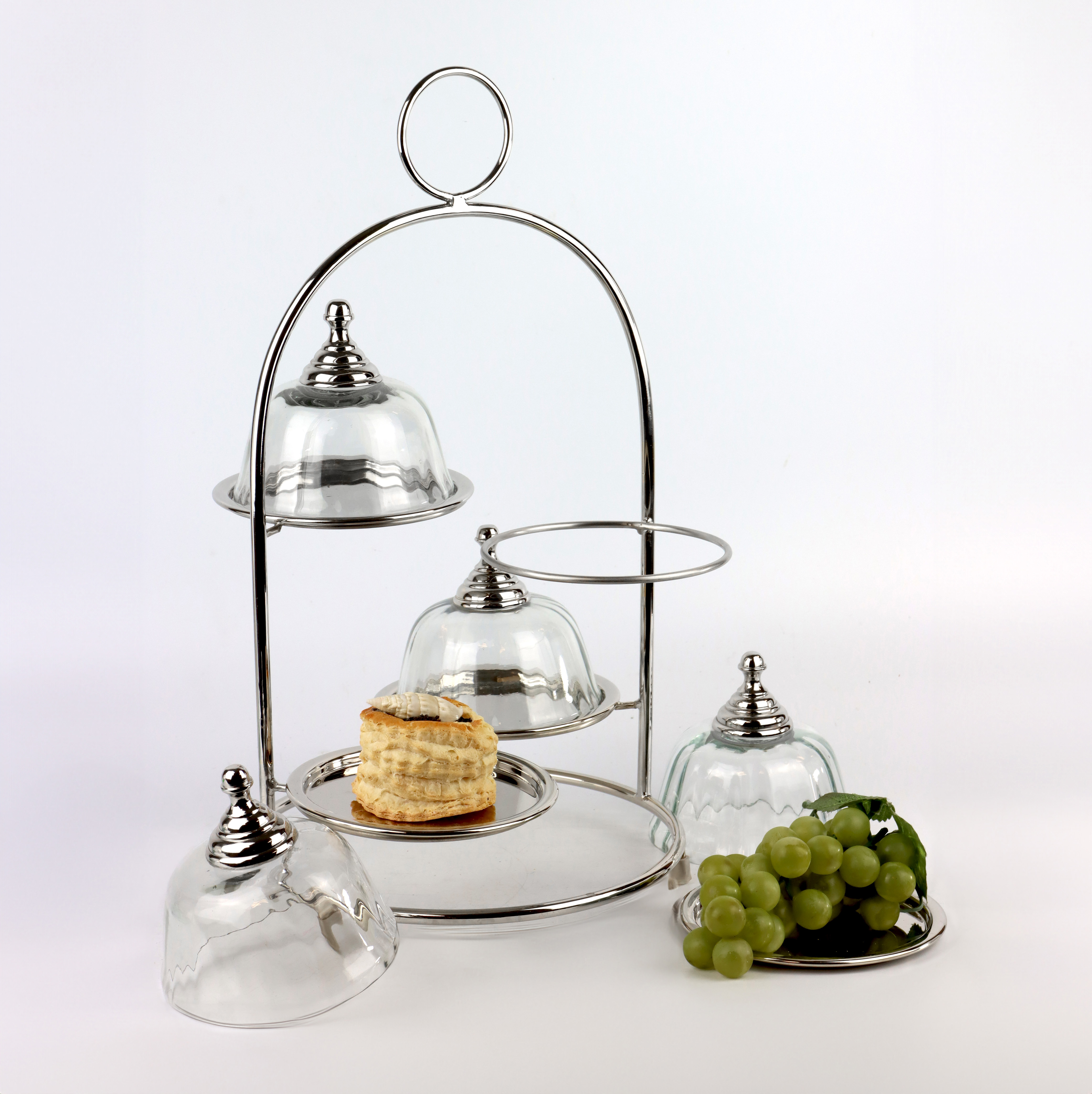 Entdecken Sie das exquisite Servierensemble "TABLE" (Artikelnummer: 9076), das speziell für den anspruchsvollen stationären Einzelhandel im Bereich Wohnen und Lifestyle entwickelt wurde. Dieses zweistöckige Servierensemble besticht durch seine eleganten silbernen Akzente und erweist sich als unwiderstehlicher Hingucker auf jedem gedeckten Tisch. Das Ensemble umfasst vier edle Glocken, die Ihrem Arrangement eine besondere Note von Raffinesse und Stil verleihen. Somit ist es nicht nur ein funktionales Werkzeug, sondern gleichzeitig ein luxuriöses Dekorelement, das Ihre Kunden begeistern wird.