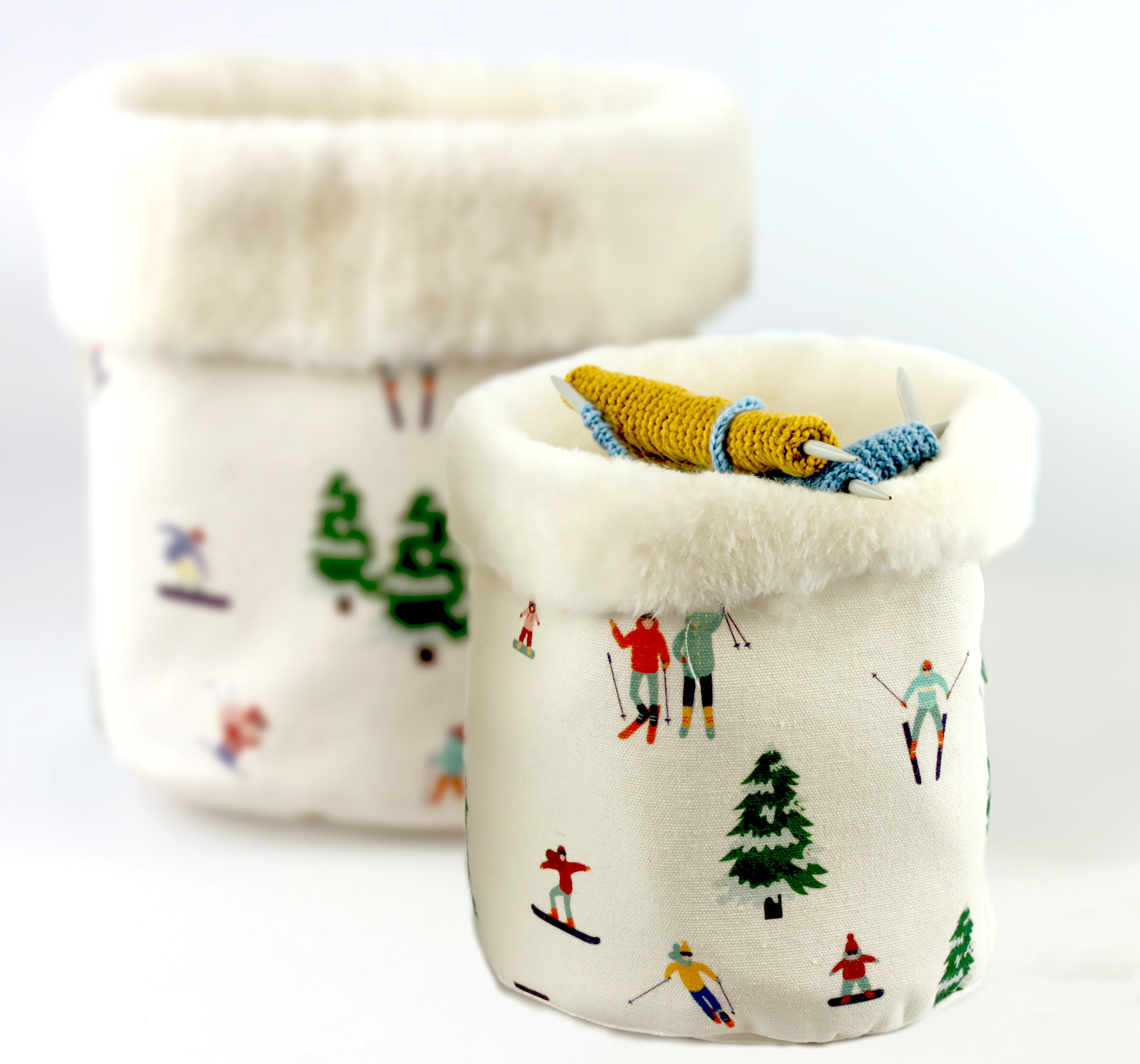 - Set aus zwei dekorativen Stoffkörben mit Skifahrer-Motiv
