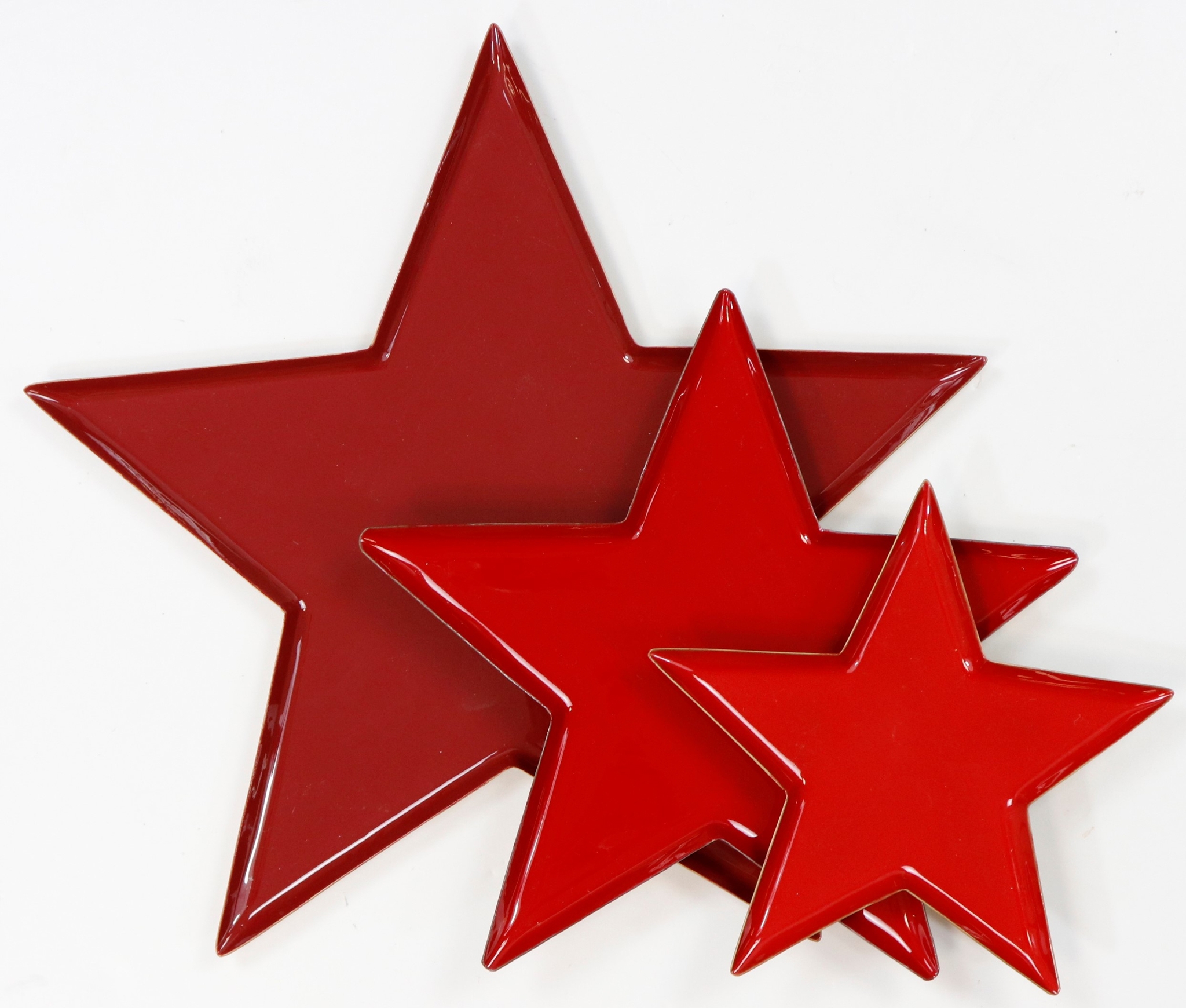 DEEntdecken Sie das neue STERNTABLETTS "DELUXE" S/3 aus unserem Weihnachtsangebot - das Herzstück in jeder festlichen Dekoration für den Wohn- und Lifestyle-Bereich. Das Set, bestehend aus drei rot lackierten Sterntabletts aus hochwertigem, robustem Eisen, bringt mit den unterschiedlichen Größen von circa 20, 28 und 38cm Abwechslung und Tiefe in Ihre Produktausstellung. Dieses handgefertigte Dreierset ist mehr als nur ein einfacher Weihnachtsschmuck. Mit seiner edlen Optik und der authentischen Haptik des Eisens, verwandeln die Sterntabletts Ihren Ausstellungsraum in eine moderne Wohlfühloase im weihnachtlichen Gewand.