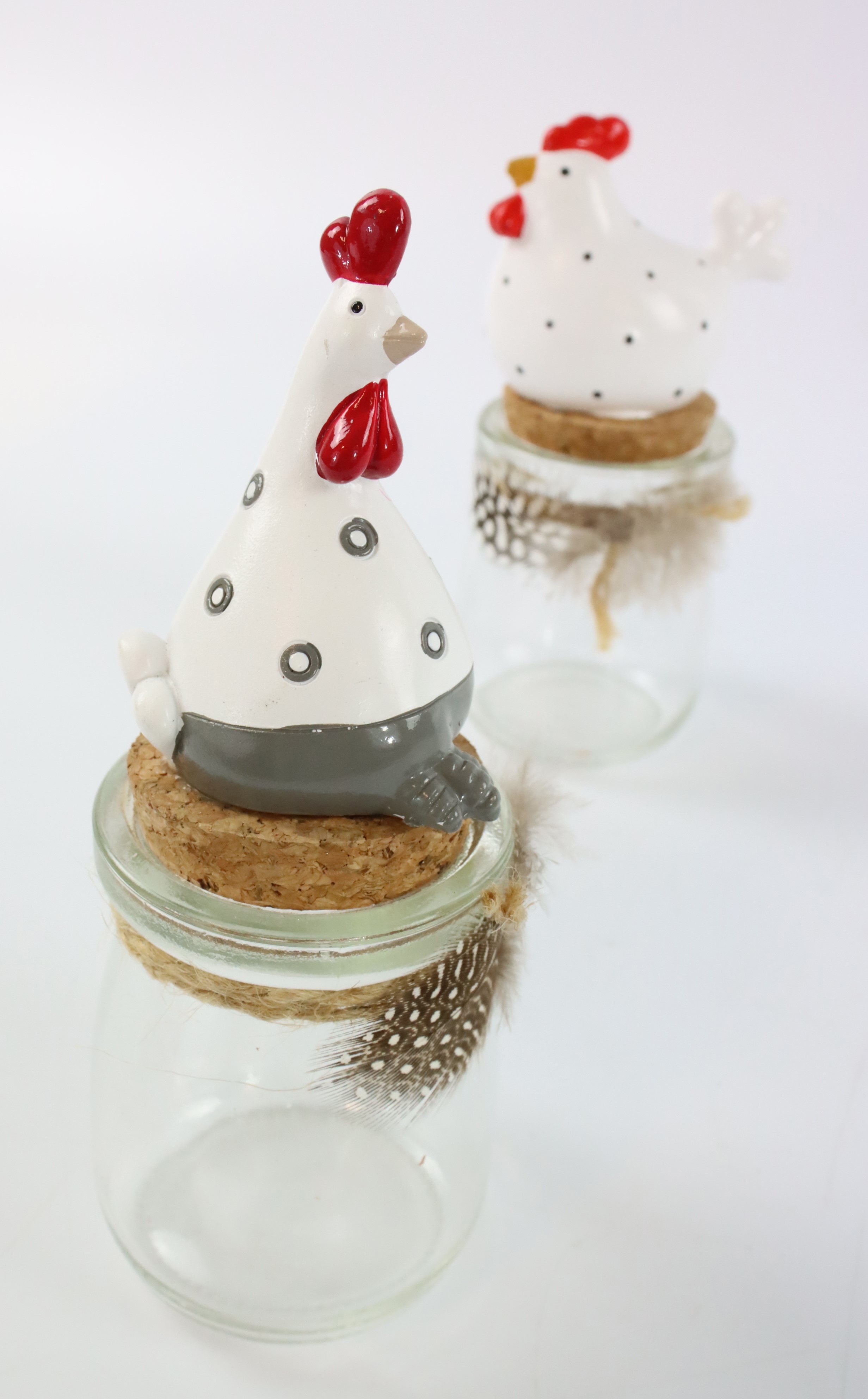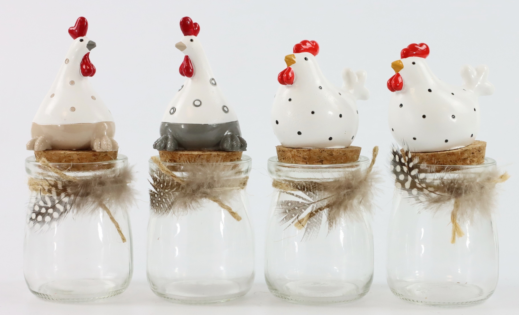 - Set besteht aus vier Glasdosen mit dekorativer weißer Henne