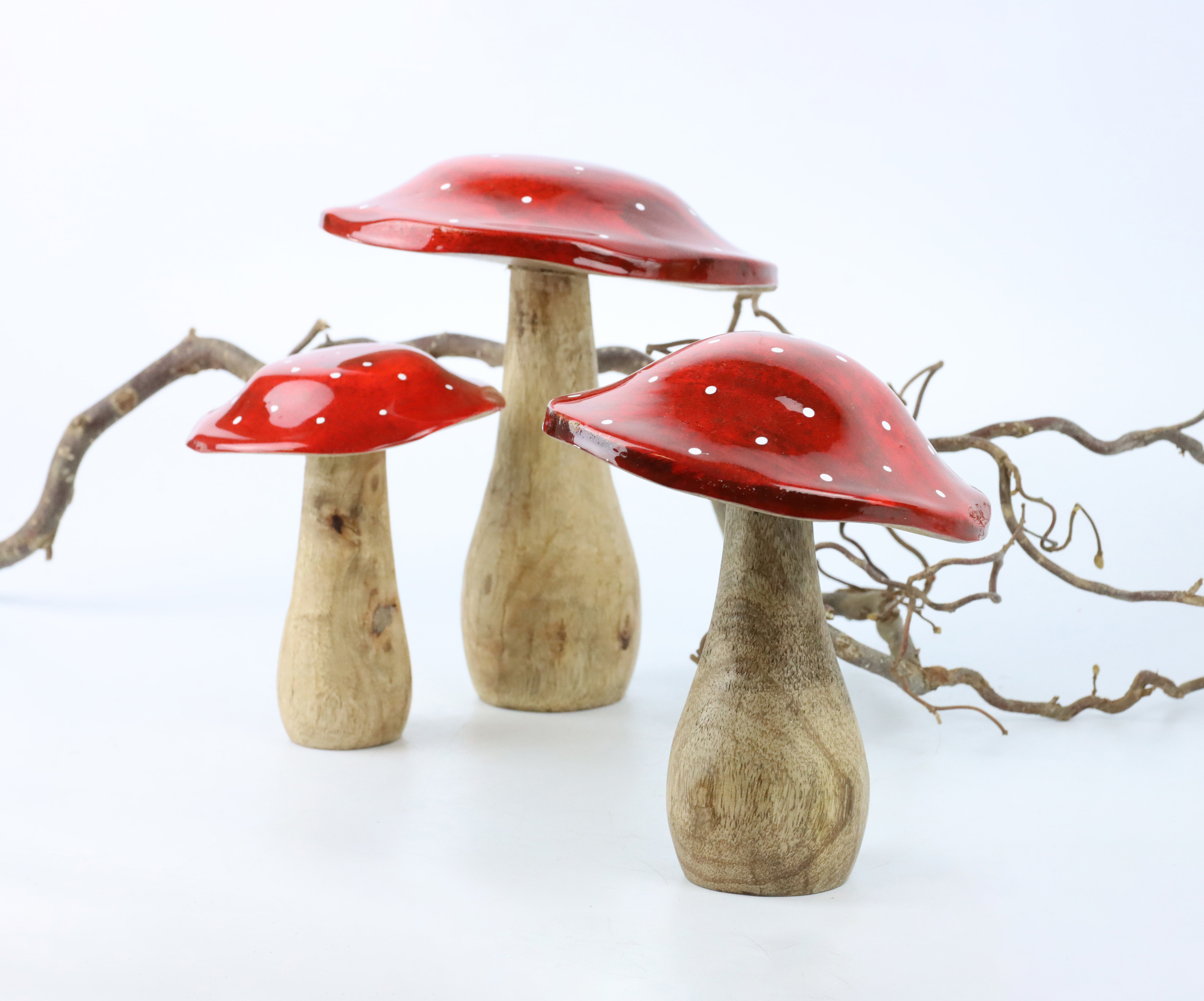DELassen Sie Ihren Einzelhandel mit der besonderen Dekoration unserer Fliegenpilze aus Mangoholz (Artikelnummer 1166) aus unserem Online-Shop zur Wohn- und Lifestylewelt aufblühen. Dieses dreiteilige Set ist perfekt zur Verschönerung jeder Umgebung und stellt eine ideale Ergänzung für Ihre herbstlichen und winterlichen Wohnaccessoires dar.