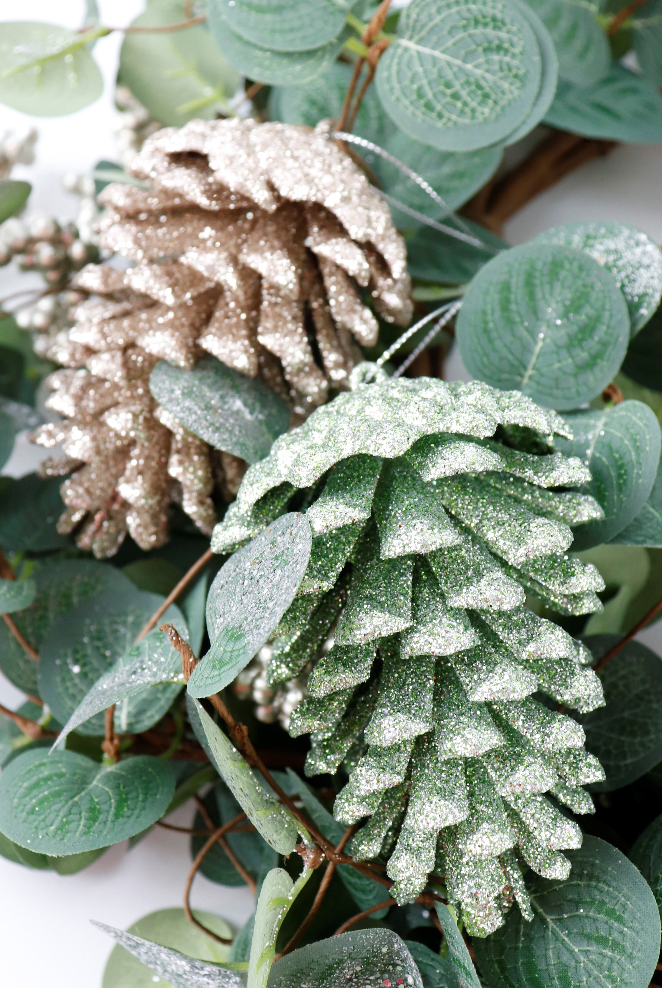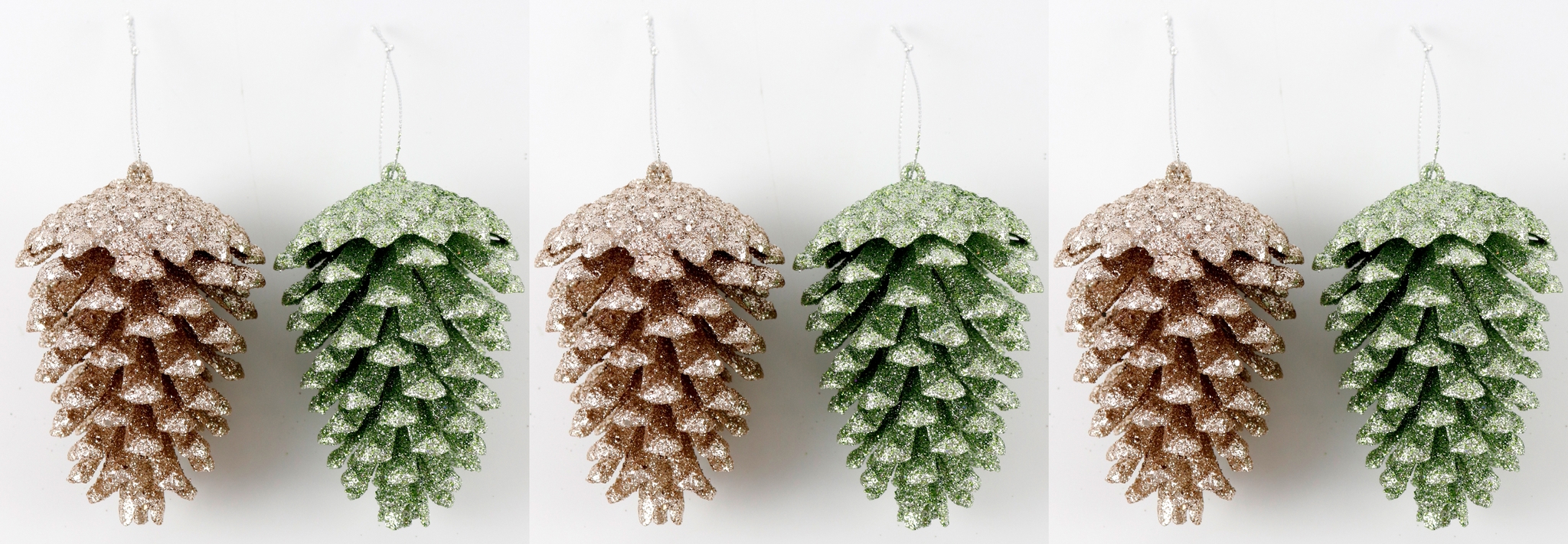 Das Set beinhaltet sechs stilvolle Anhänger. Diese sind jeweils wie Zapfen geformt und kreieren mühelos eine winterliche und besinnliche Stimmung. Das Design besticht durch eine harmonische Farbkombination aus edlem Gold und frischen Grün. Beide Farben ergänzen sich perfekt und verleihen Ihrem weihnachtliche Einrichtung den letzten Schliff.