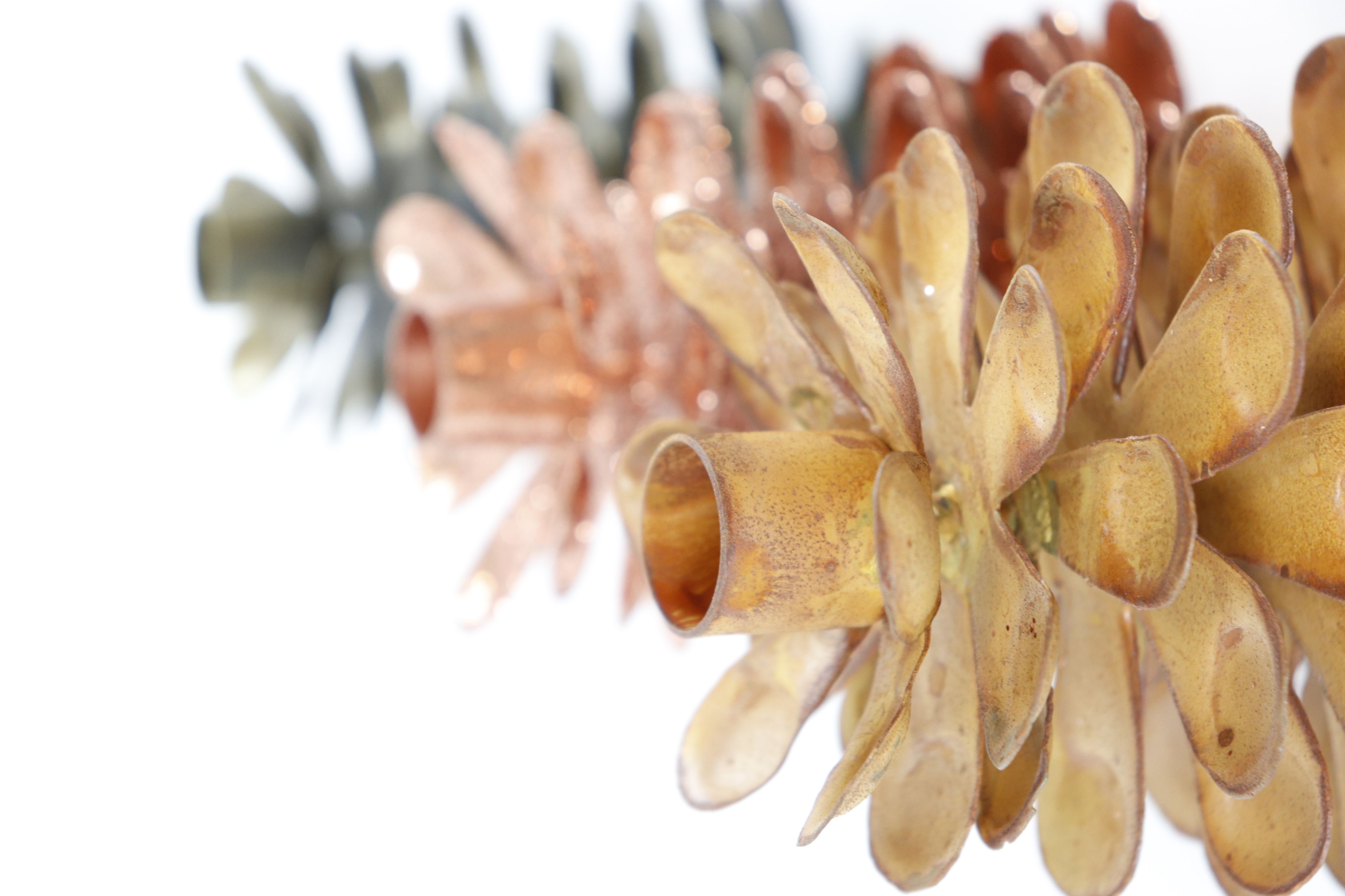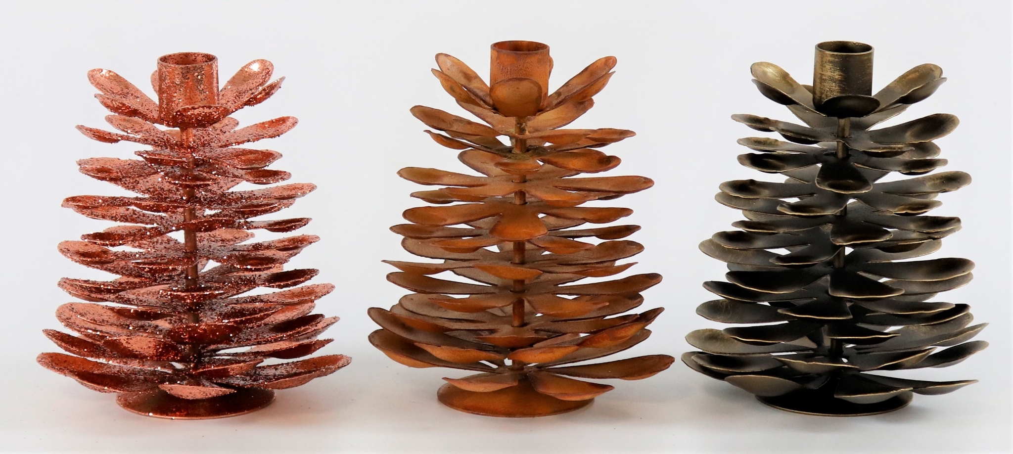 Das Set beinhaltet drei individuell designte Leuchter, welche die Form von Tannenzapfen haben. Jedes Exemplar ist aus hochwertigem Metall gefertigt und misst ungefähr 15cm, was sie praktisch und vielseitig in der Platzierung macht. Sie können diese Leuchter auf einem Beistelltisch, auf einem Fensterbrett, auf dem Kaminsims oder in einem Bücherregal positionieren und Sie werden sehen, wie sie sofort einen charmanten Akzent setzen.
