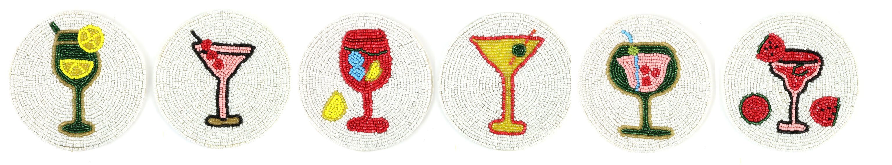 Discover our stylish 6-piece "Cocktails" bead coaster set that will add a touch of elegance and charm to your spring and summer events. These artfully designed coasters are perfect for creating a stylish ambience in any living room or on your patio while protecting your furniture.
