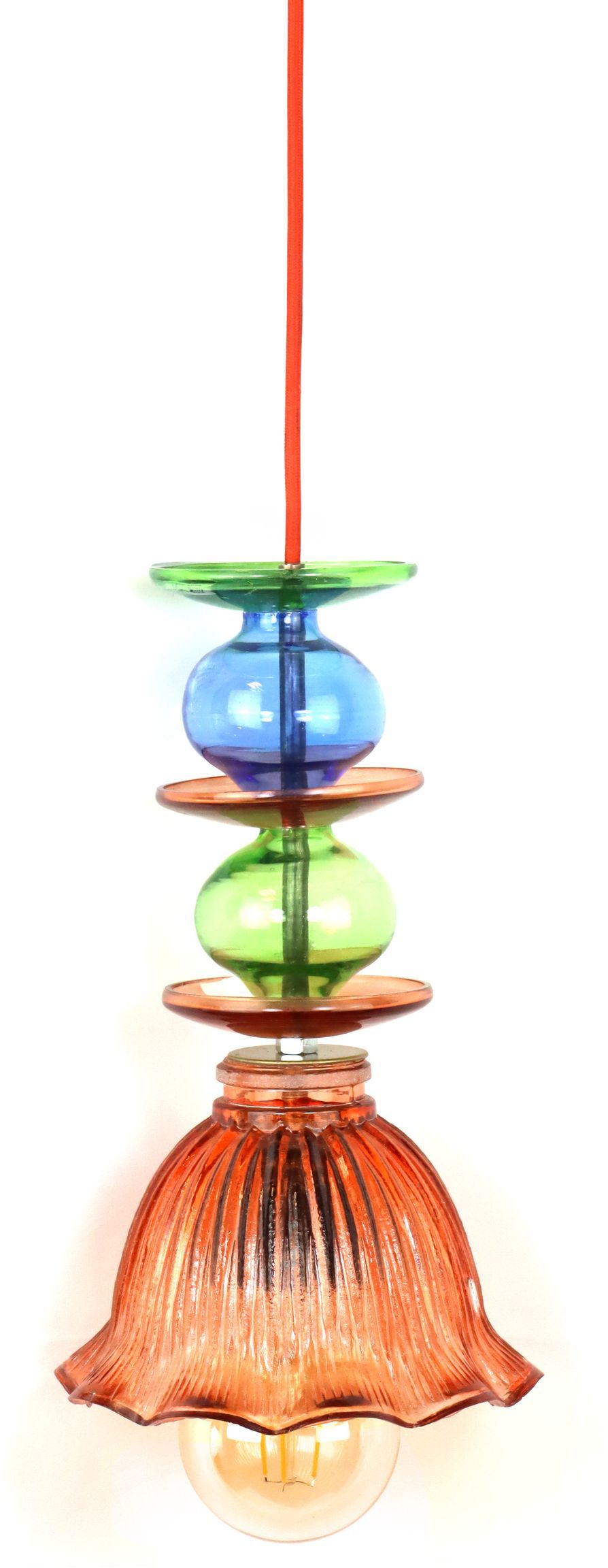 The "JEU DE LUMIÈRE" hanging lamp is a work of art made of glass and metal that perfectly combines design and functionality. The lampshade in bright orange is an eye-catcher and blends seamlessly into modern interiors. The varied colour scheme and the fine glass material give this lamp a unique charm that will delight your customers.