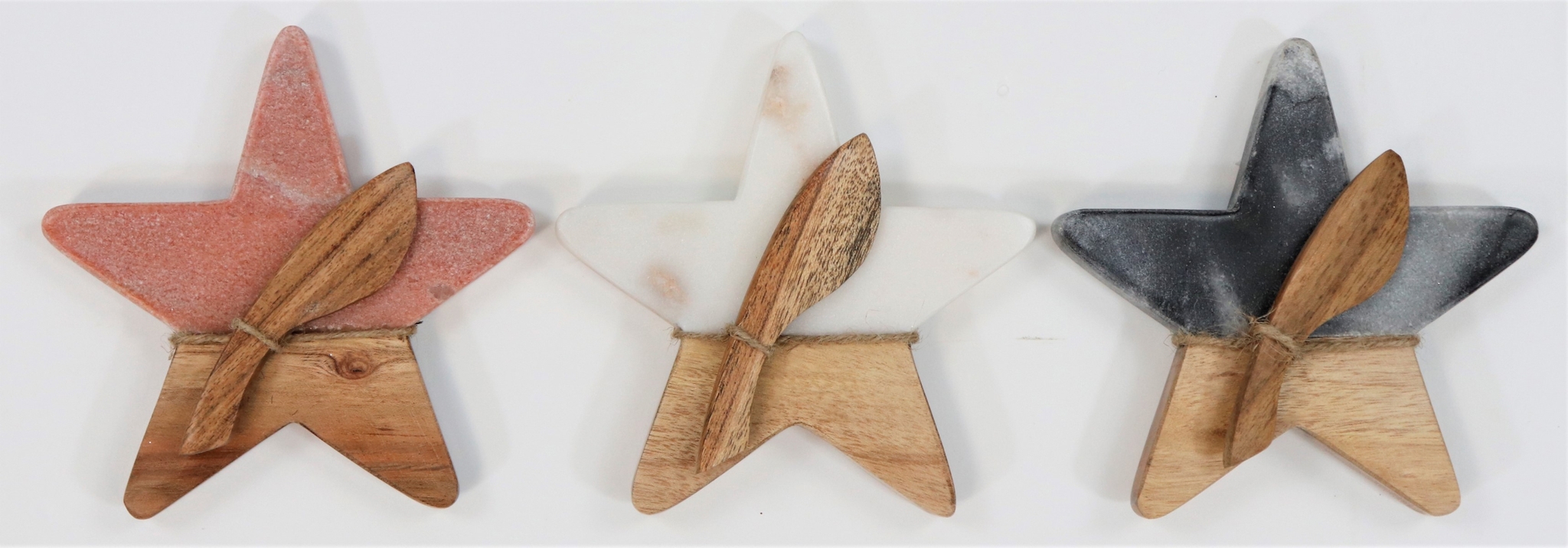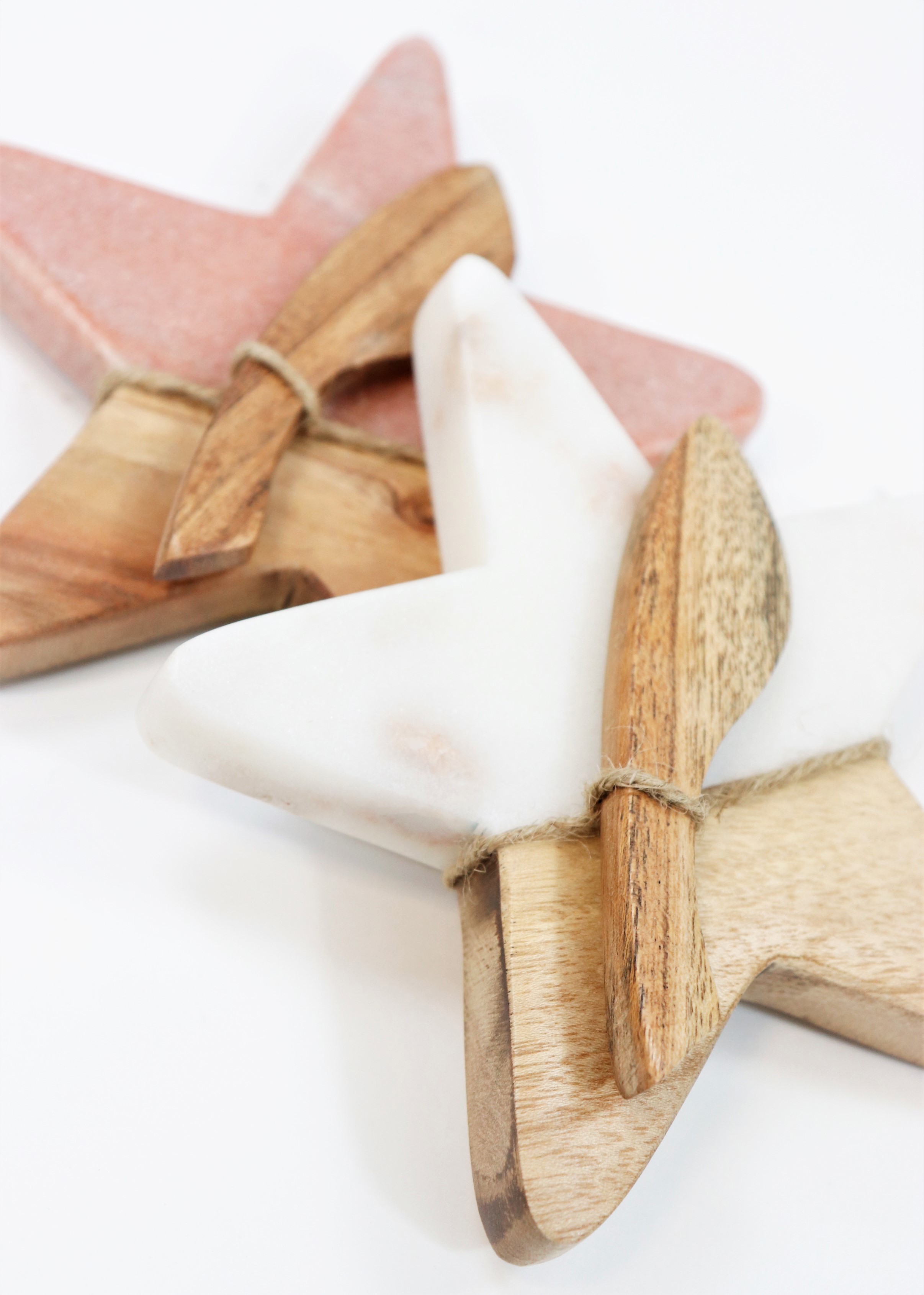 The "Star" serving board set is a must-have for every stationary retailer who wants to offer their customers unusual and stylish accessories. These boards are ideal for presenting appetisers, cheese variations or Christmas biscuits - a perfect addition to larger festive table arrangements. The combination of marble and wood gives each piece a unique, rustic feel, while the jute detail adds a subtle but effective texture.