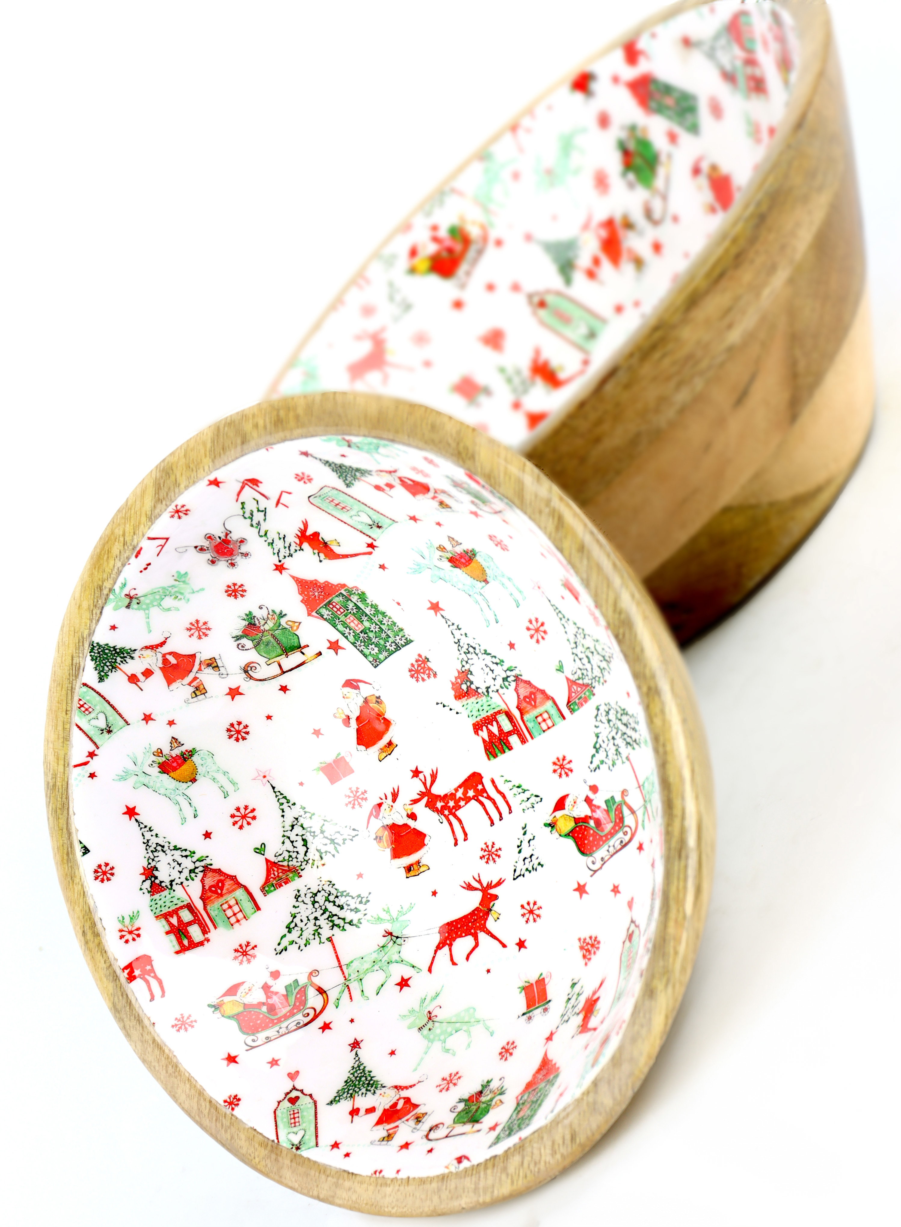 - Set consisting of two wooden bowls with a wintery Christmas motif