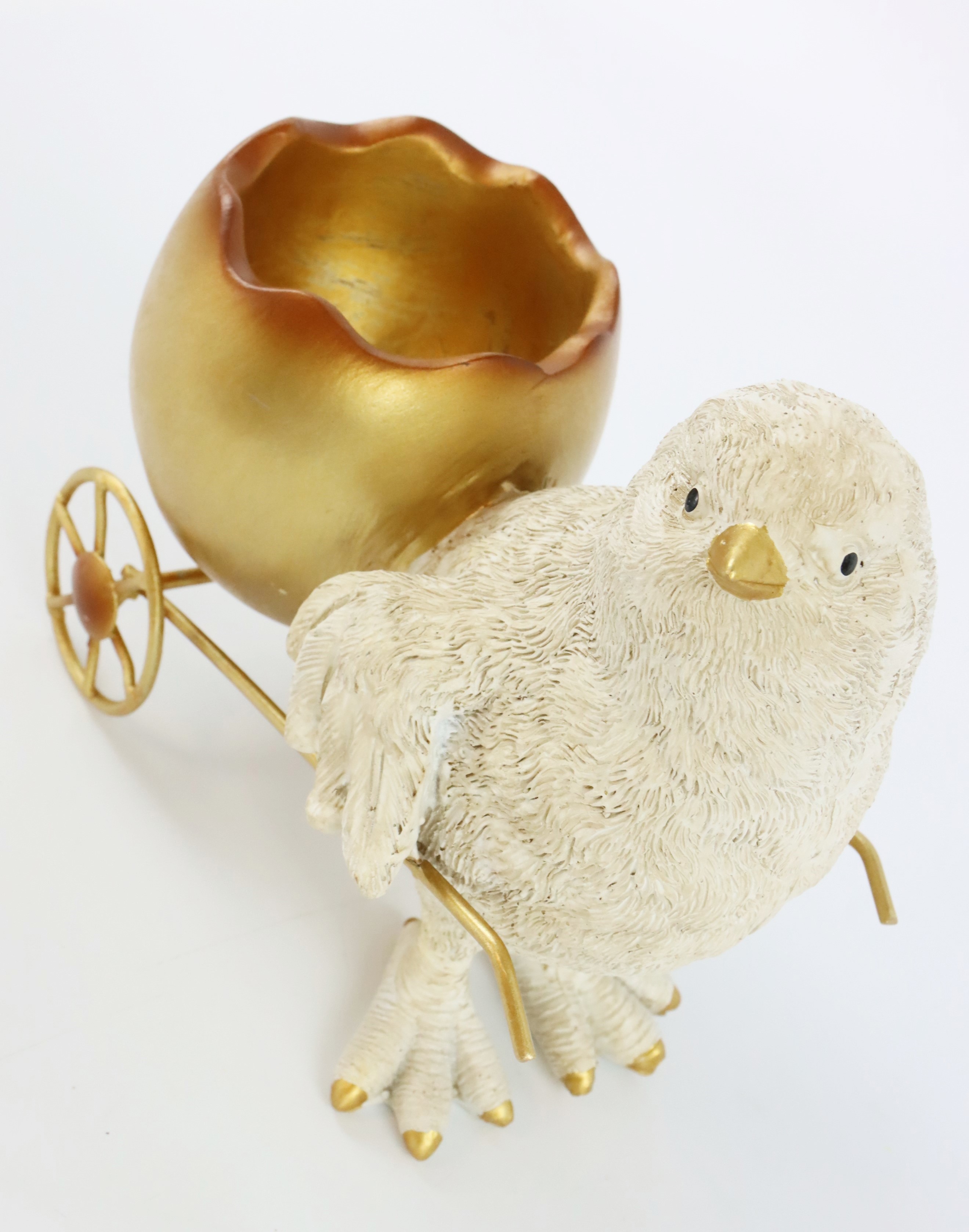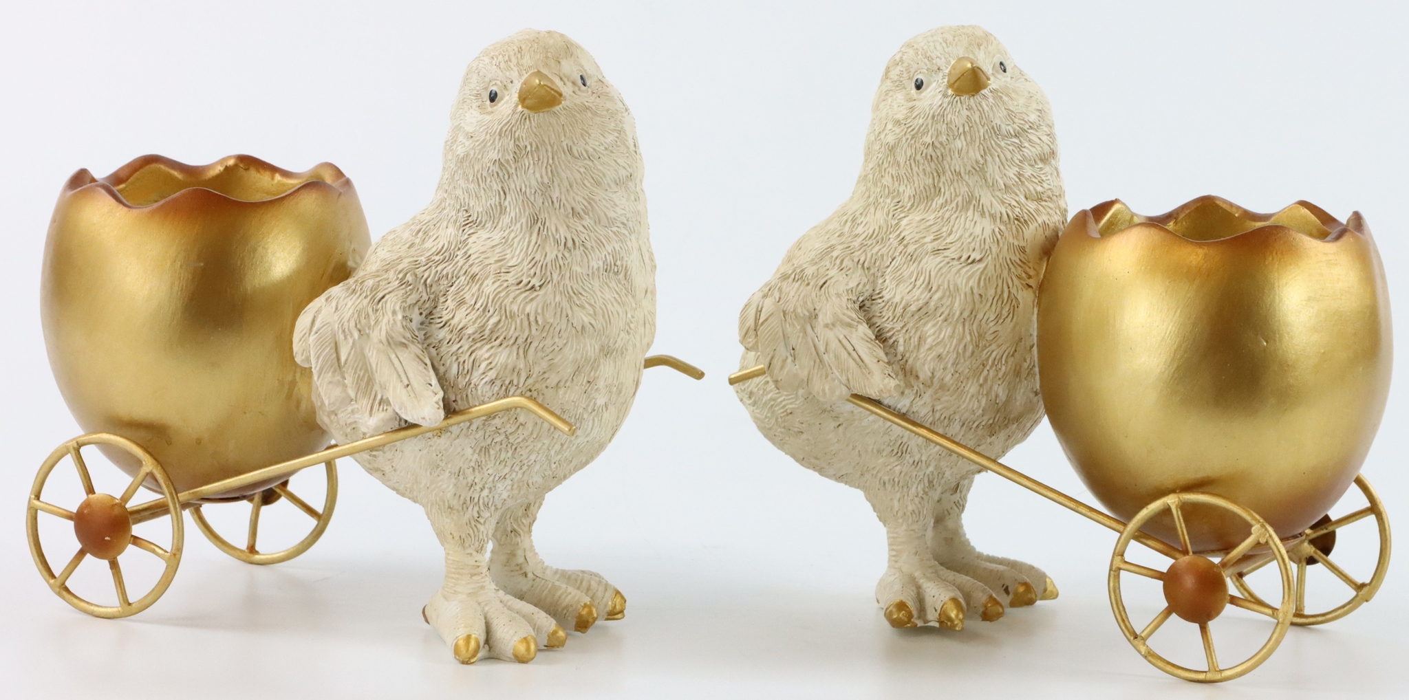 The "Racing Chicks" are two cute chicks accompanying a small egg wheelbarrow. Each chick is detailed and around 16 cm high, making the figures a great addition to any Easter jewellery collection. The durable polyresin ensures that the figurines are long-lasting and easy to care for - perfect for frequent use as decoration.