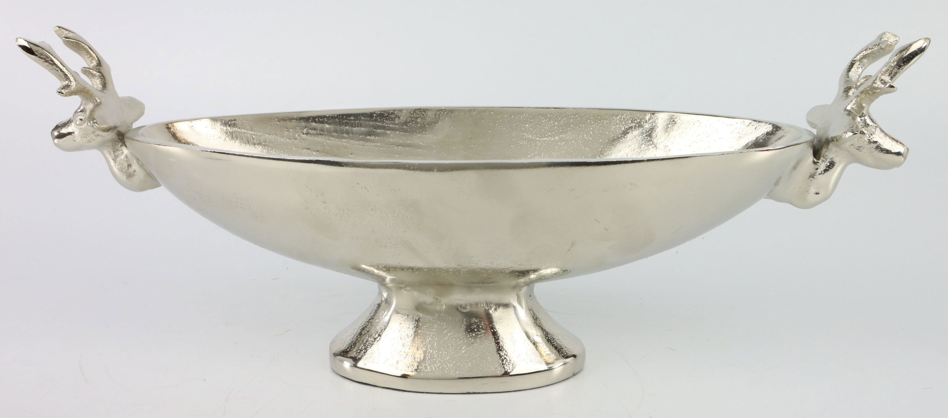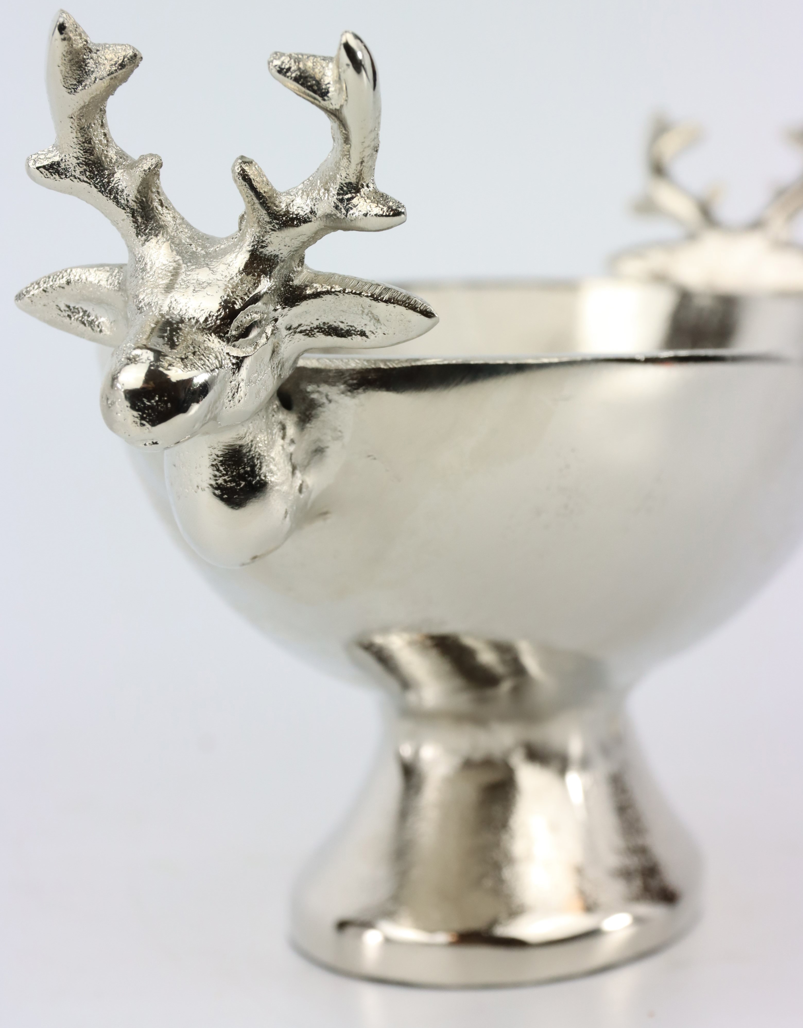 The "Stag" jardiniere presents itself in sublime elegance with its silver lustre and its impressive size of around 35 cm. The material - high-quality nickel - is durable and robust, ensuring long-lasting enjoyment for your customers. This classy home décor item is characterised by its detailed finish and eye-catching stag design, which adds a special touch to any room.