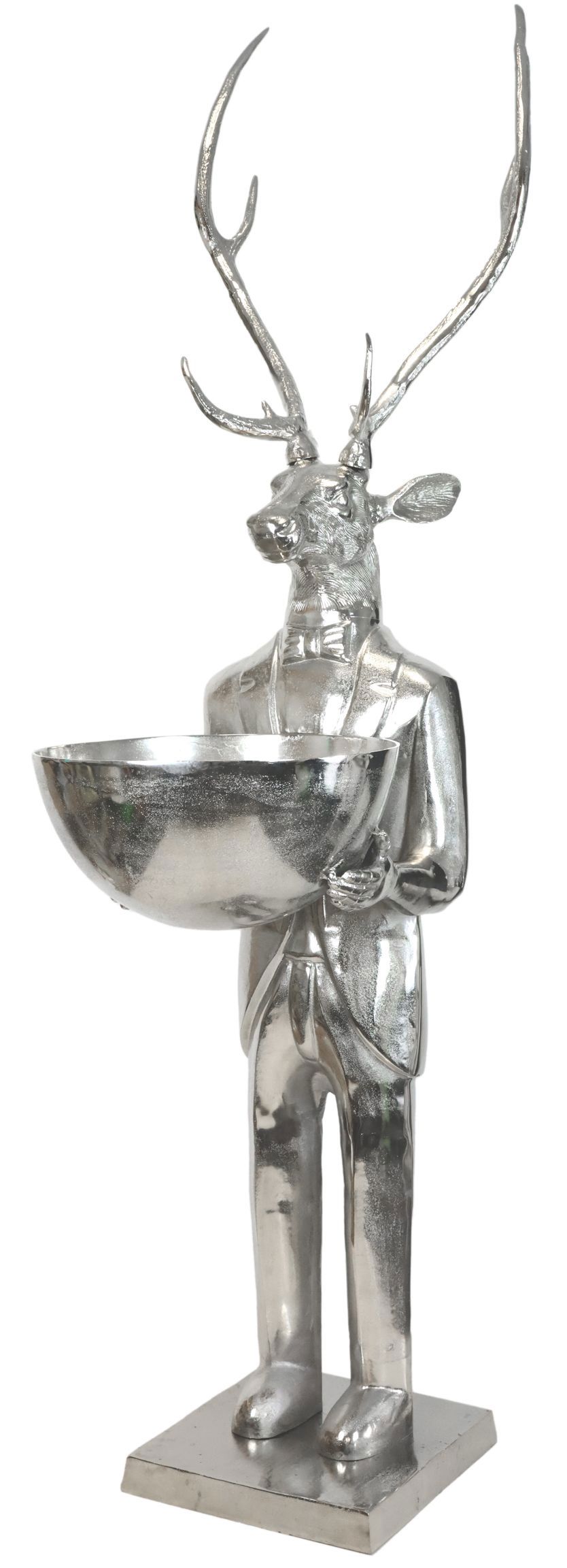 Discover the exquisite XL-BUTLER "HIRSCH", the ultimate highlight of your Christmas decorations. This silver deer butler is not only an eye-catcher, but also extremely practical for presenting snacks, biscuits or festive accessories. With its majestic presence, it will enchant your customers in the home and lifestyle sector and is ideal in shop window displays or as a central eye-catcher in decorative arrangements.