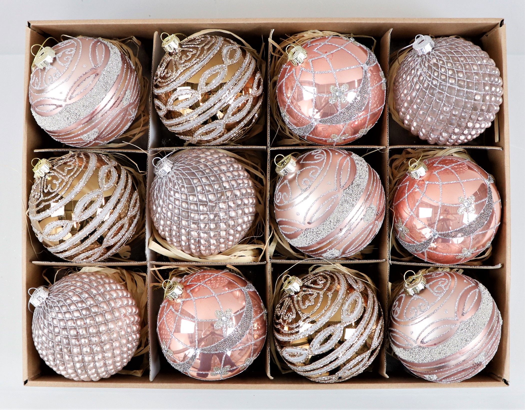 Item number:7936 - Our VINTAGE-BOX "GLASS BALLS" S/12 is a true ornament for any Christmas decoration. This unique 12-piece set of delicate pink glass baubles, measuring approximately 10 cm in diameter, will add a touch of romance and nostalgia to your festive celebrations. Stylishly presented in an elegant vintage box, these glass baubles are an excellent addition to your Christmas assortment.