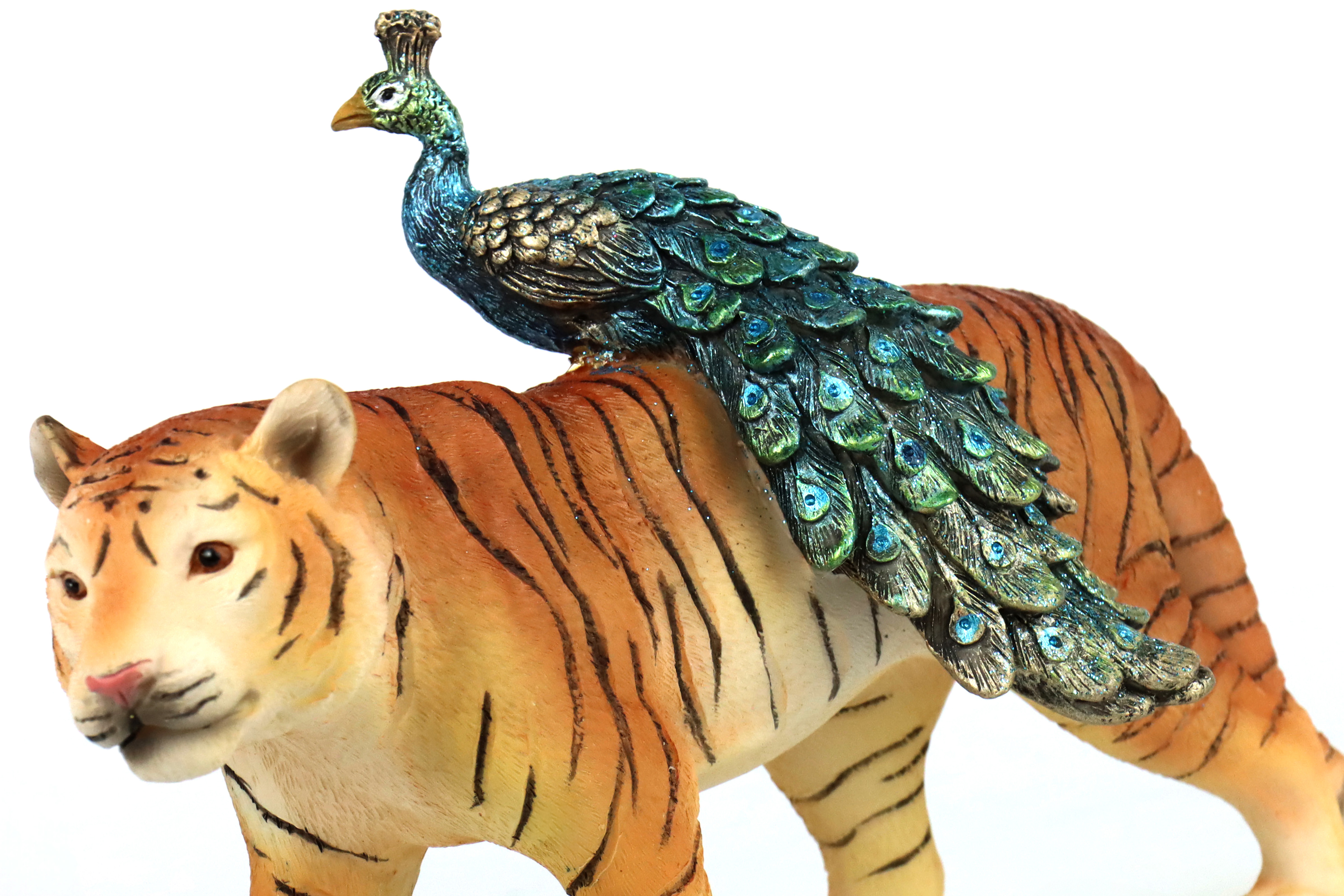 Sumérjase en un mundo de elegancia y exotismo con la exclusiva FIGURA "CARNIVALE". Esta impresionante decoración es perfecta para la venta de artículos de papelería en el sector del hogar y el estilo de vida, y garantiza atraer la atención de todos. La artística escultura combina de forma fascinante la majestuosidad de un tigre con el colorido esplendor de un pavo real, lo que la convierte en un auténtico reclamo en cualquier habitación. Con su detallada elaboración y su diseño único, la FIGURA "CARNIVALE" es una verdadera obra de arte que añadirá un toque exclusivo a su gama.