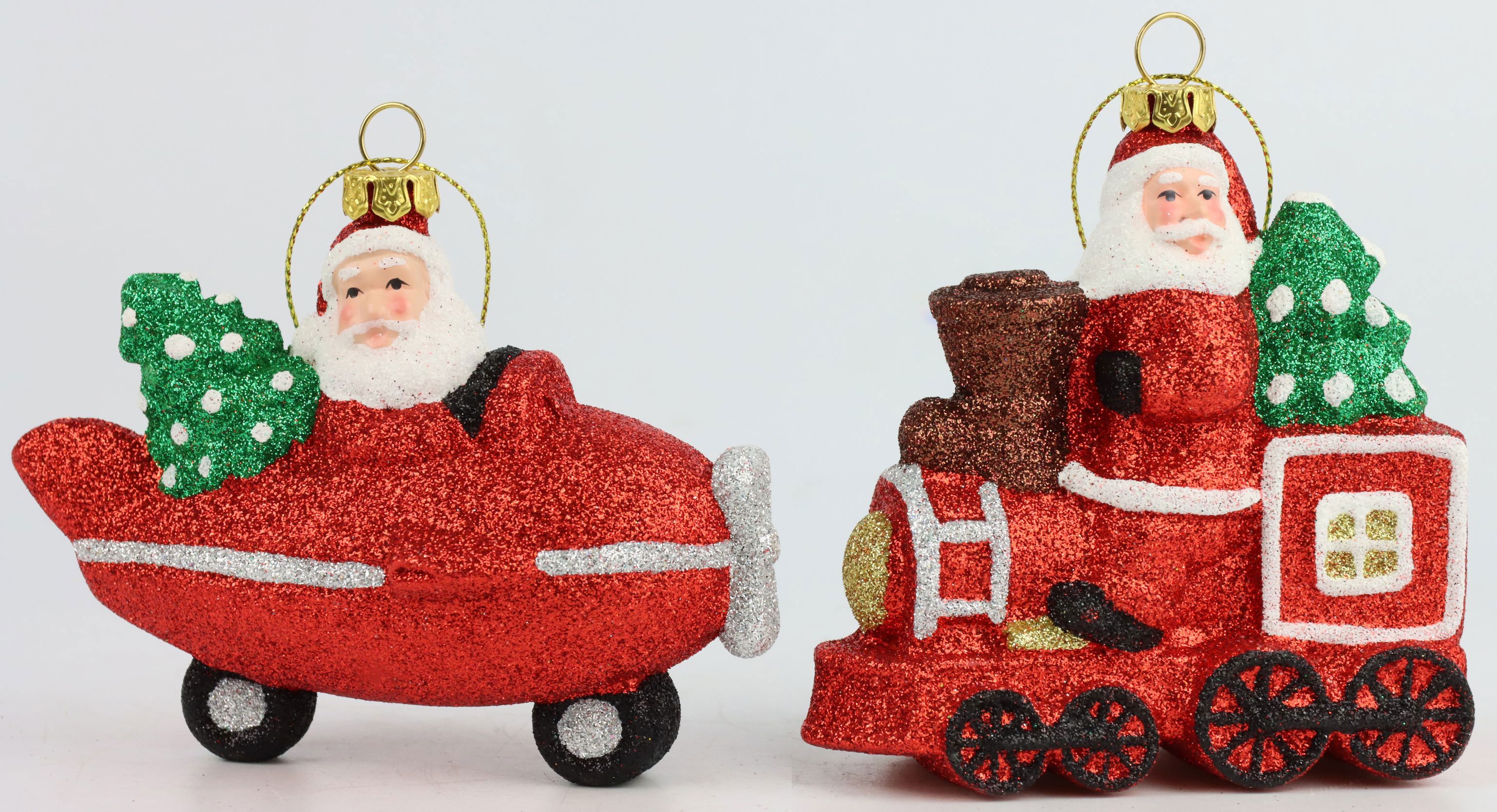 El set de 2 piezas incluye un Papá Noel en un avión y otro en un tren. Fabricadas en plástico de alta calidad, estas pequeñas obras de arte impresionan por su magnífico acabado y la riqueza de sus detalles. Con aproximadamente 9 cm de largo y adornados con purpurina brillante, estos adornos serán el prestigioso punto culminante de sus decoraciones festivas.