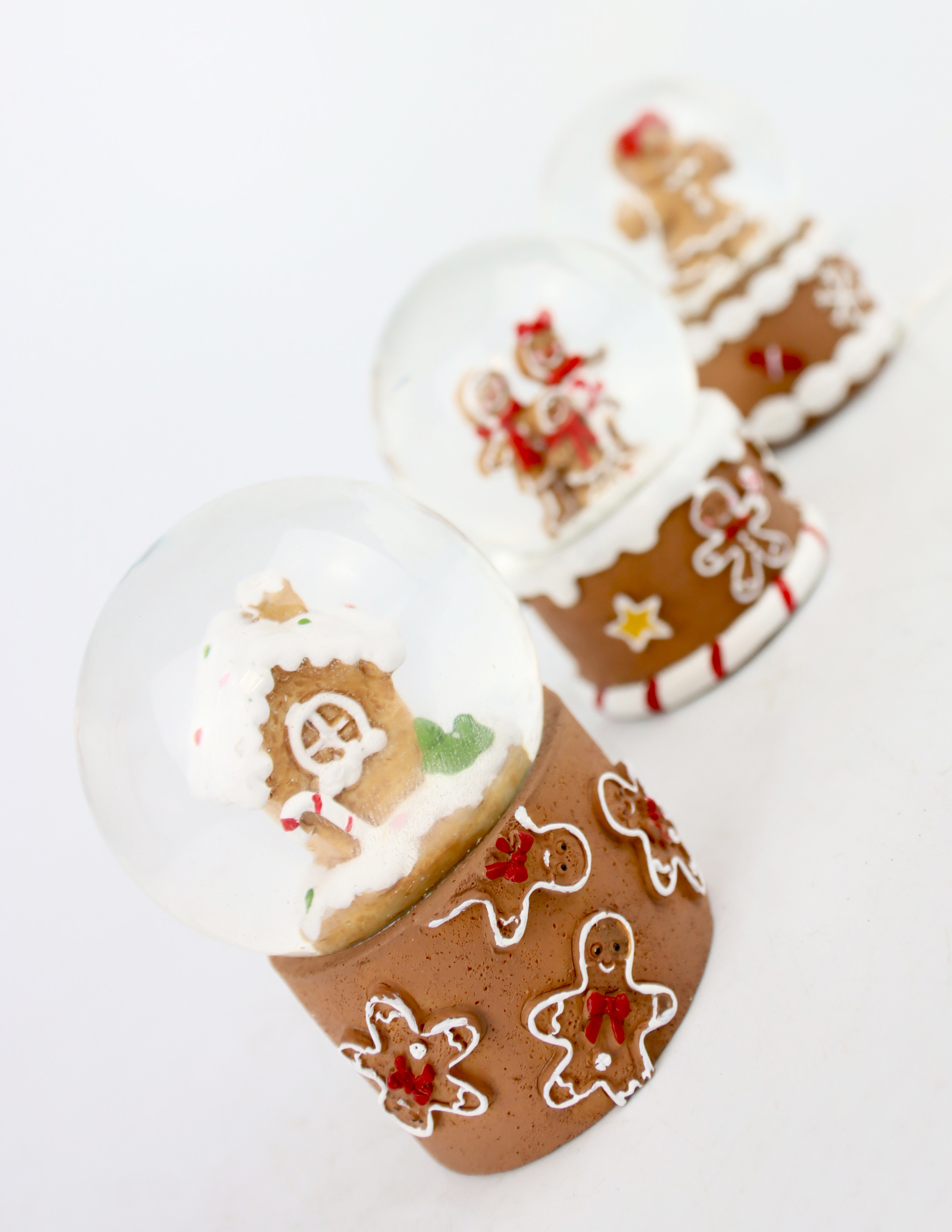 - Encantador juego de 3 piezas**: Tres bolas de nieve con hombres de jengibre fabricadas en poliresina y cristal.