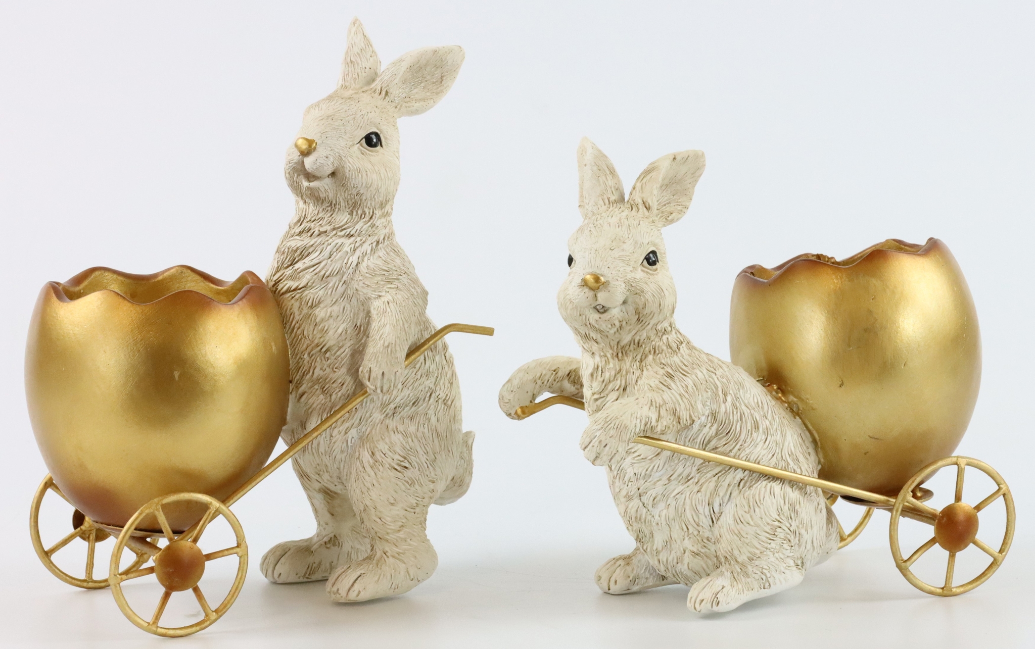 ES**Descripción del producto: Figuras "Conejos de carreras" S/2 para Pascua - Conejitos decorativos con carretilla de huevos de poliresina**