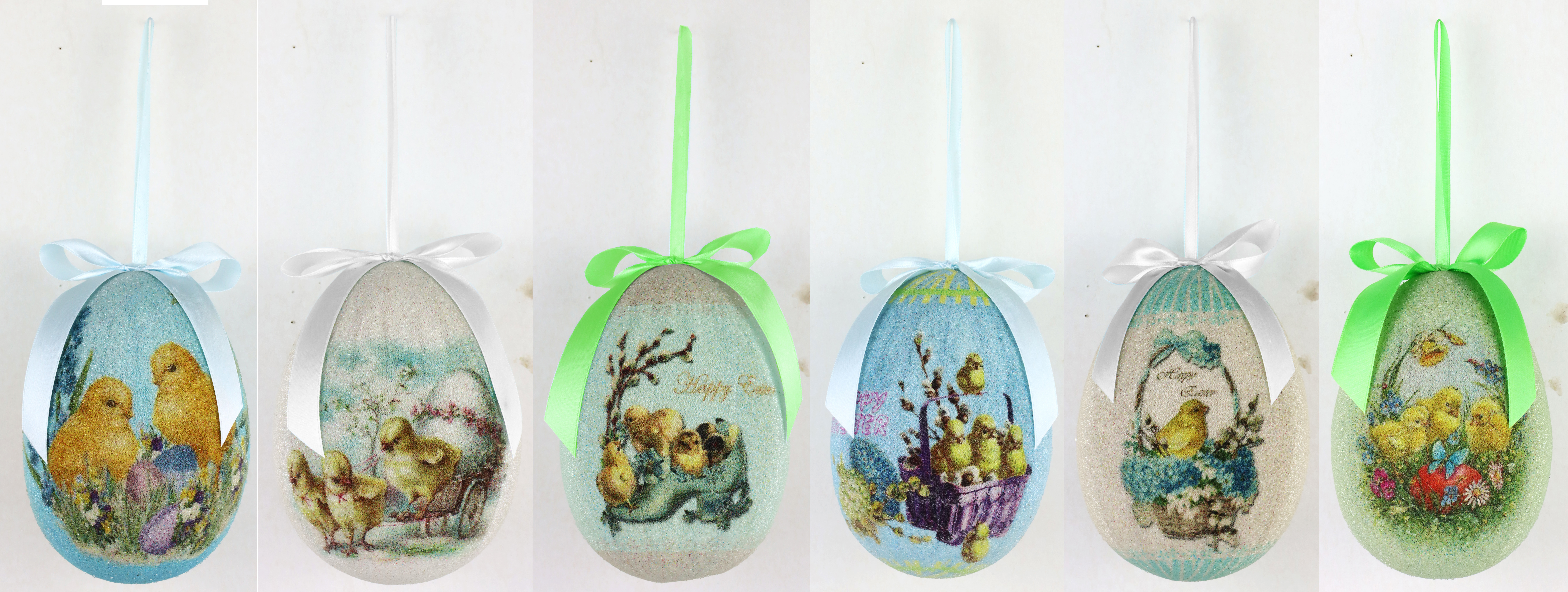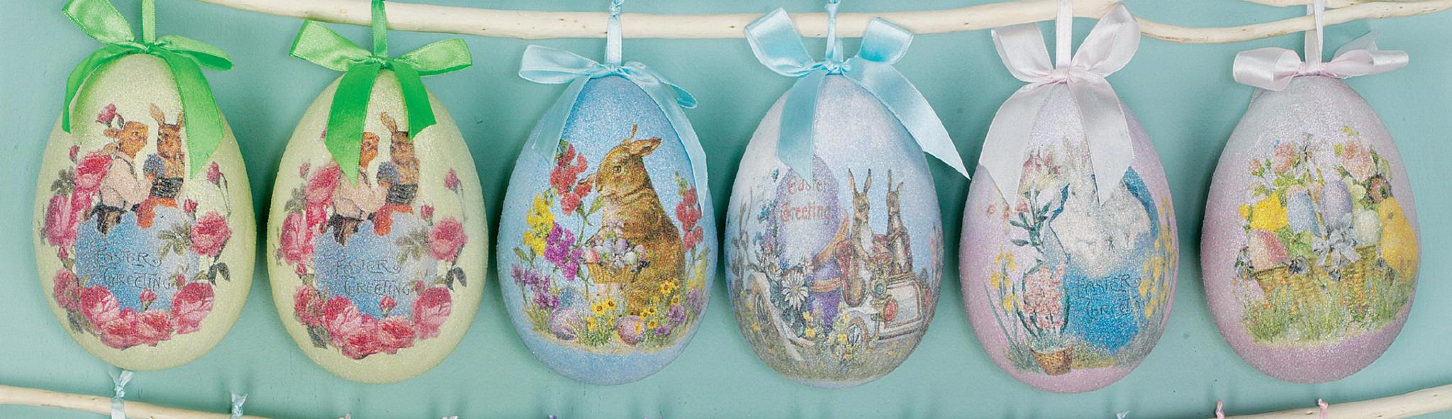 - Decoración llamativa:** Juego de seis huevos colgantes de diseño nostálgico que miden aprox. 15 cm.