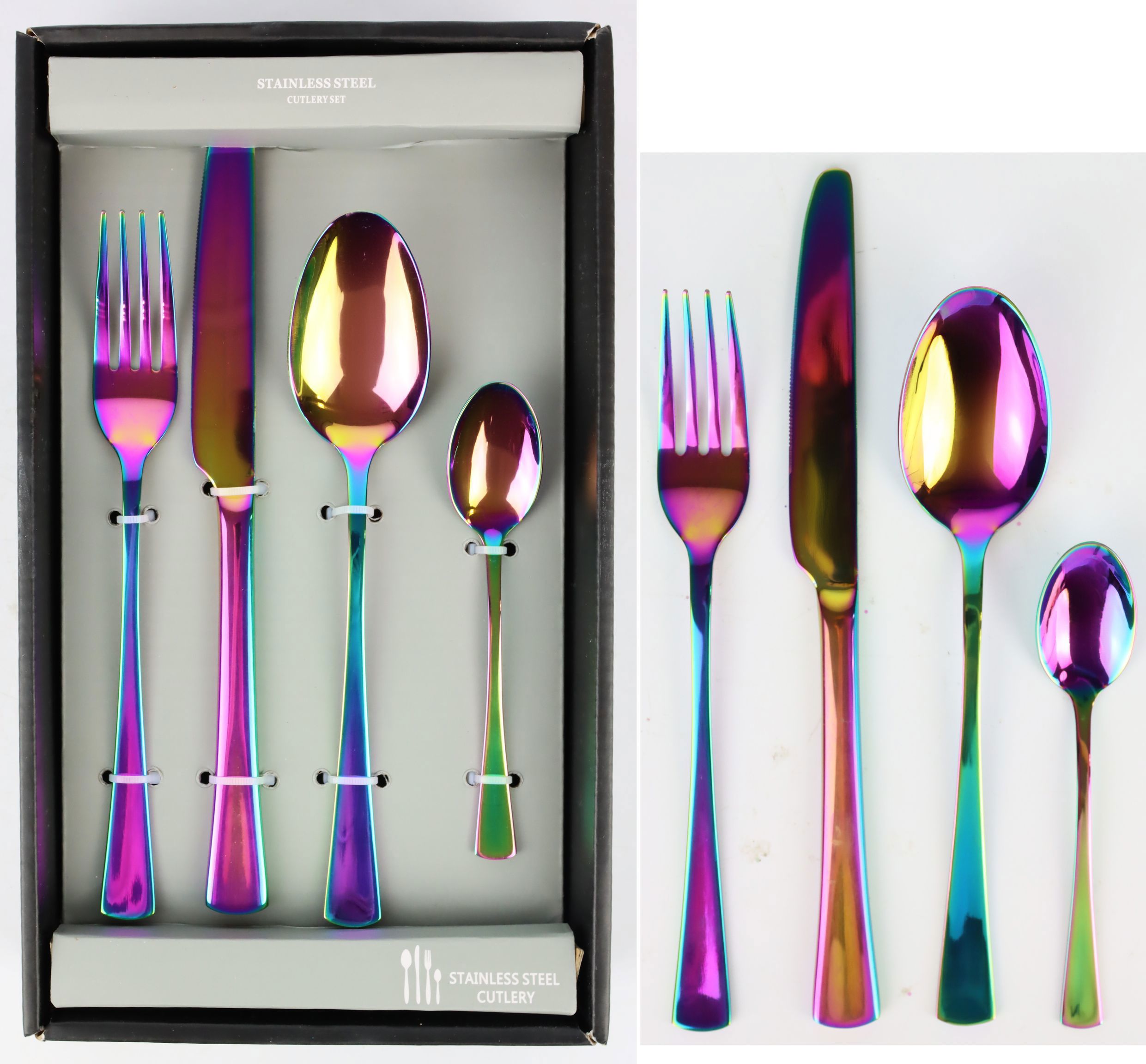 Fabriqué en acier inoxydable de haute qualité, ce set de couverts n'est pas seulement un point fort visuel, il est aussi extrêmement robuste et durable. Il offre un maniement confortable et un poids agréable qui enrichit aussi bien les repas quotidiens que les dîners les plus raffinés. Grâce à l'acier inoxydable, les couverts restent brillants et ne perdent pas leur charmant aspect arc-en-ciel, même après un usage fréquent et un nettoyage au lave-vaisselle.