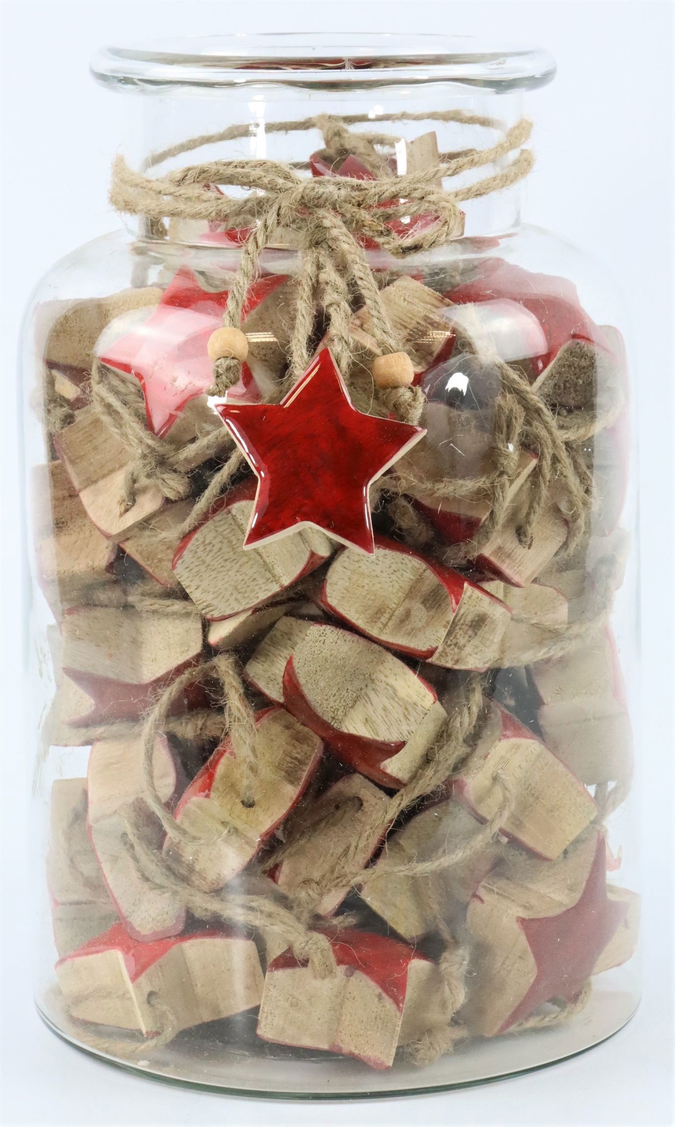 L'ensemble est présenté dans un joli verre d'une hauteur d'environ 26 cm. Le bocal ne sert pas seulement à présenter les étoiles en bois de manguier, mais peut également être utilisé comme élément décoratif dans votre propre maison.