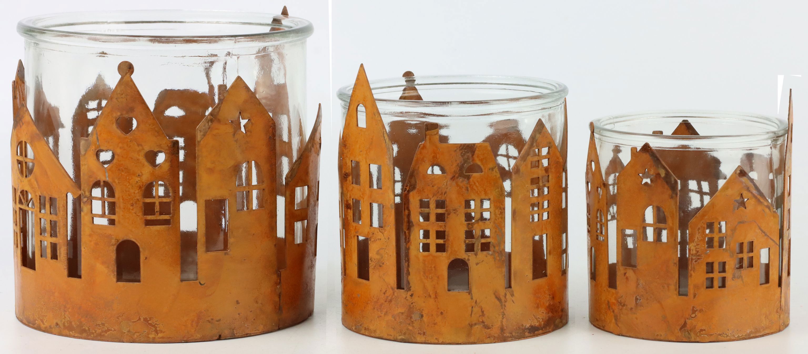 - Set di tre lanterne/casette in metallo di dimensioni 15 cm, 12 cm e 10,5 cm.