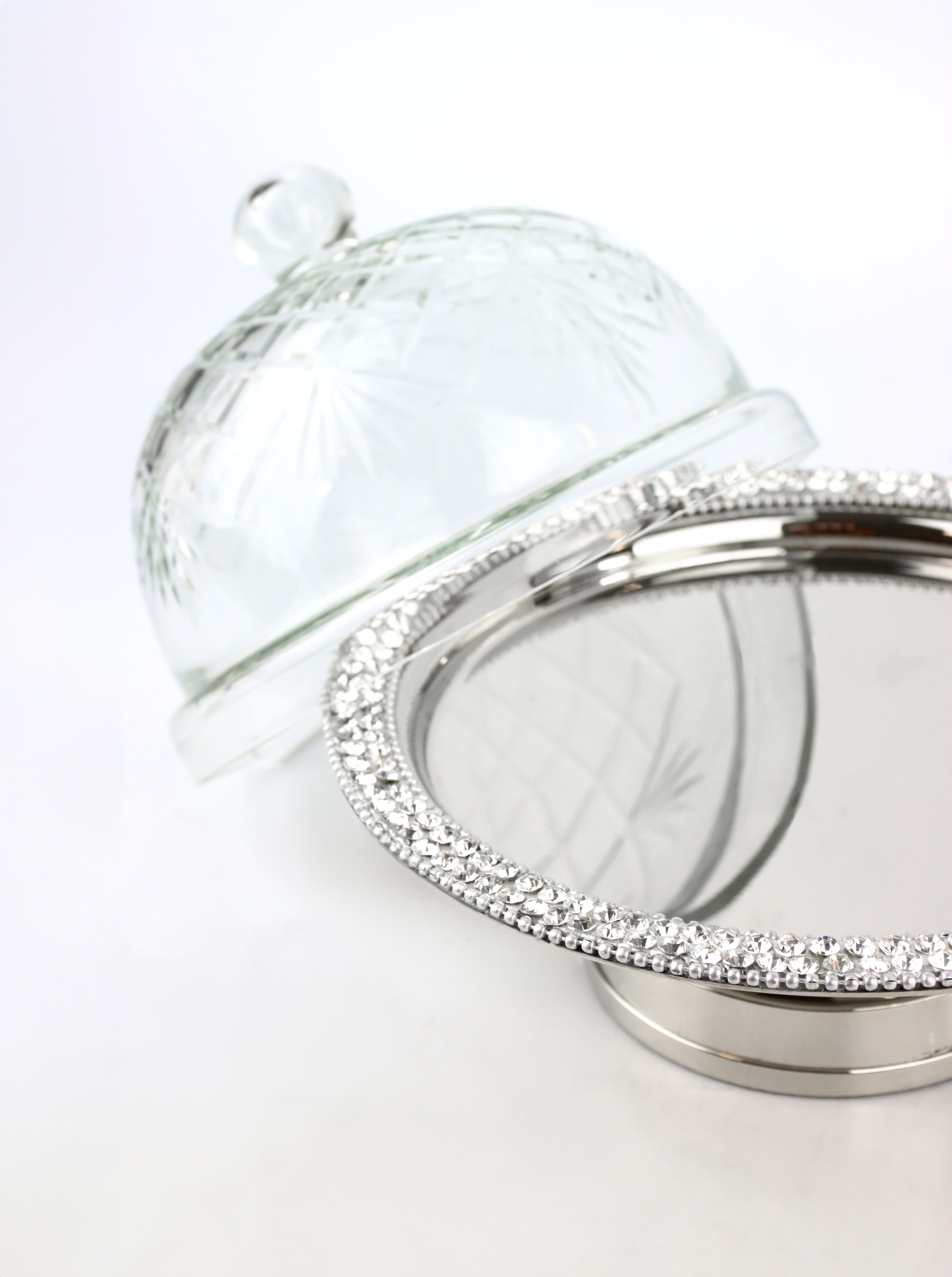 DE**Produktbeschreibung: Elegante Glasglocke "CRISTALLO" mit edlem Strassrand in Silber**