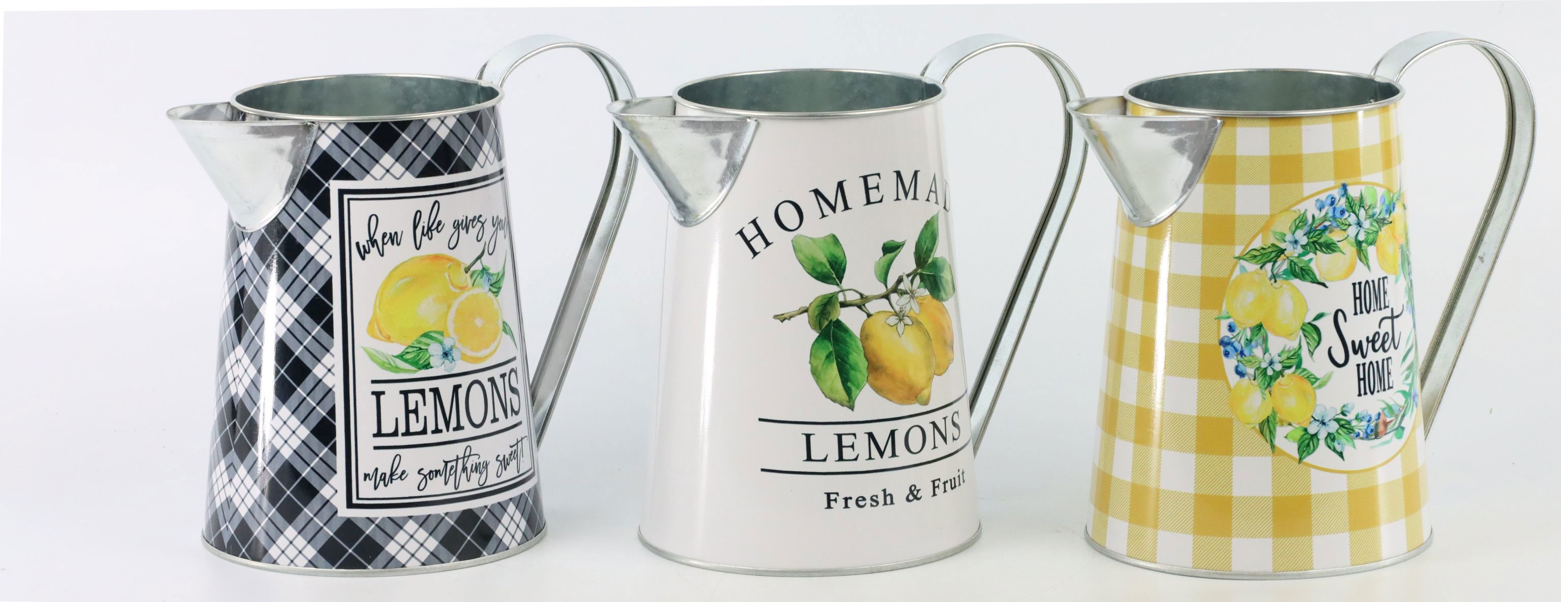 Das Set besteht aus drei unterschiedlich großen Kannen, die jeweils mit einem ansprechenden Zitronenmotiv verziert sind. Diese lebhaften Akzente fangen das Gefühl des Frühlings und Sommers ein und bringen Farbe in jede Umgebung, egal ob im Interieur-Bereich, auf der Terrasse oder im Garten. Mit einer Höhe von circa 20,5 cm sind diese Henkelkannen vielseitig einsetzbar – sei es als dekorative Blumentöpfe im Schaufenster, als auffälliges Element im Regal oder sogar als originelle Gießkannen.