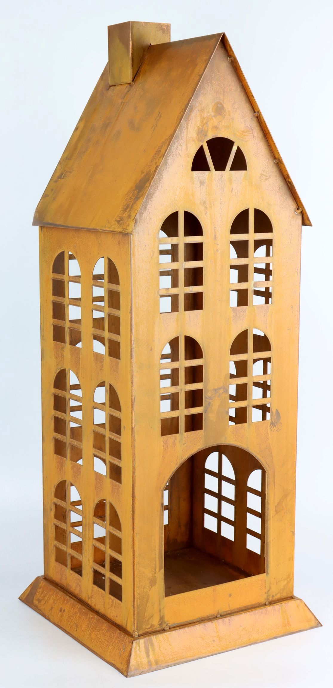 Das Laternenhaus "La Ville", Artikelnummer 7286, ist aus robustem Eisen gefertigt und in einem rostigen Farbton gehalten, der das Design des Artikels insgesamt vintage und einzigartig macht. Es weist eine beachtliche Höhe von etwa 65 cm auf und ist daher ein echter Eyecatcher in jedem Raum.