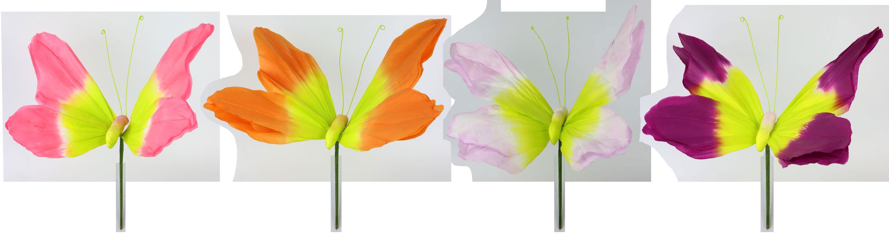 Das Set besteht aus vier prächtigen Schmetterlingen, hergestellt aus hochwertigem Papier und robustem Eisendraht. Mit einer Größe von ca. 50 cm sind sie ideal, um als faszinierende Blickfänger in Schaufenstern oder als dekorative Elemente in Verkaufsräumen eingesetzt zu werden. Ihre anmutige Gestaltung und die frühlingshaften Farben machen sie zur idealen Dekoration für die Saison Frühjahr/Sommer, und sie sind perfekt geeignet, um jeder Umgebung eine lebendige Atmosphäre zu verleihen.