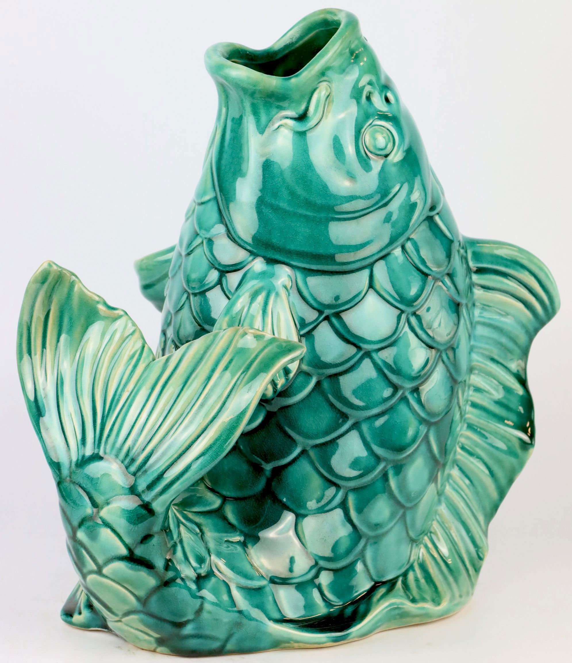 Erleben Sie den frischen Atem des Frühlings und Sommers mit unserer exquisiten Vase "Lucky Fish". Diese wunderschöne Vase, mit einem ansprechenden Fischmotiv, zieht in jeder Umgebung alle Blicke auf sich. Sie ist aus hochwertiger Keramik gefertigt und überzeugt durch ihre lebendige grüne Farbgebung. Mit einer Höhe von ca. 30 cm eignet sich die Vase ideal, um sowohl kleinere als auch größere Blumenarrangements stilvoll zu präsentieren.