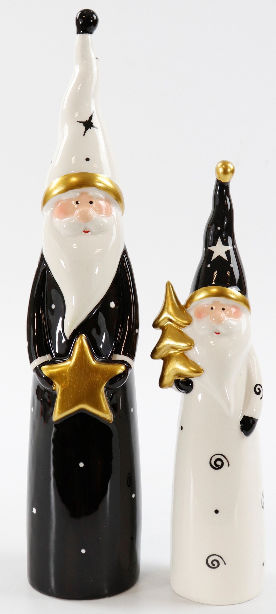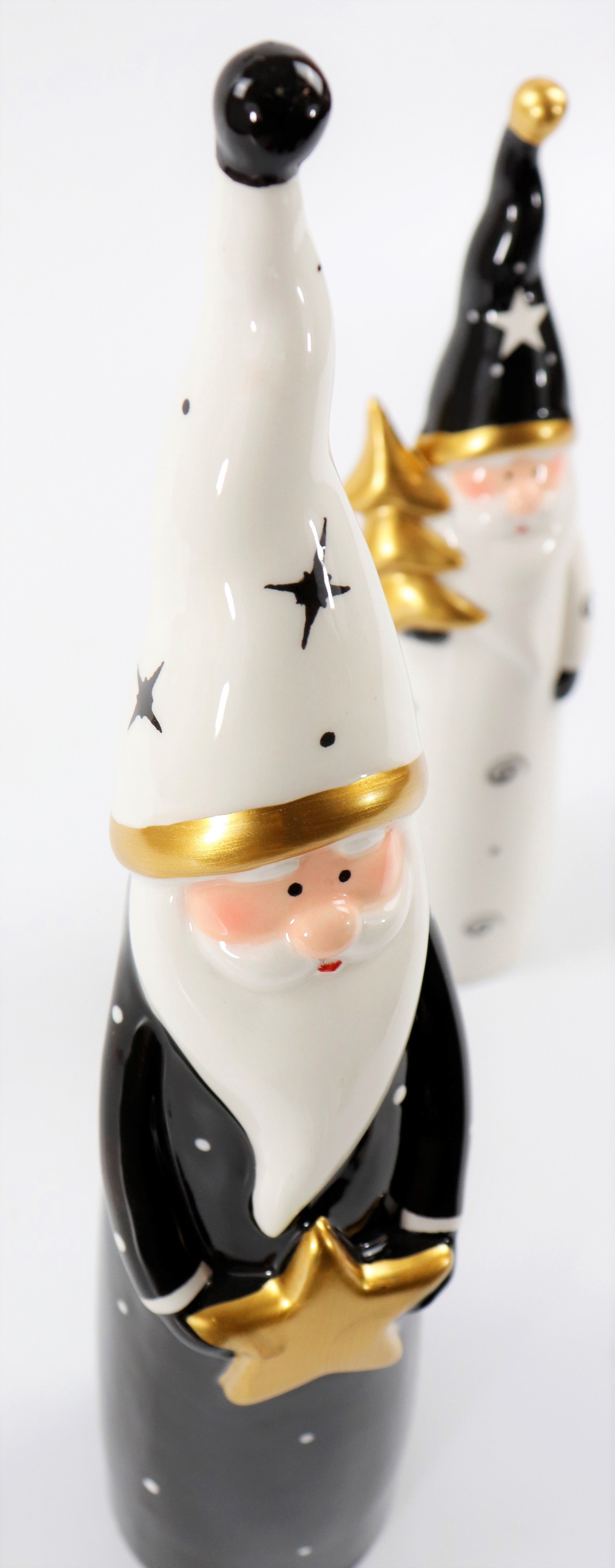 Bereiten Sie Ihr Geschäft auf die festliche Weihnachtszeit vor und beeindrucken Sie Ihre Kunden mit unseren exquisiten Weihnachtsdekorationsartikeln. Unser 2-teiliges Set „Figuren Weihnachtsmann“ bringt das magische Flair der Feiertage in Ihre Räumlichkeiten und schlägt die Brücke zwischen traditionellem Charme und modernem Design. Mit einer Höhe von etwa 25 cm und 34 cm bestechen diese Keramikfiguren durch ihre zeitlosen Farben – Weiß und Schwarz – die stilvoll jedes Ambiente aufwerten.