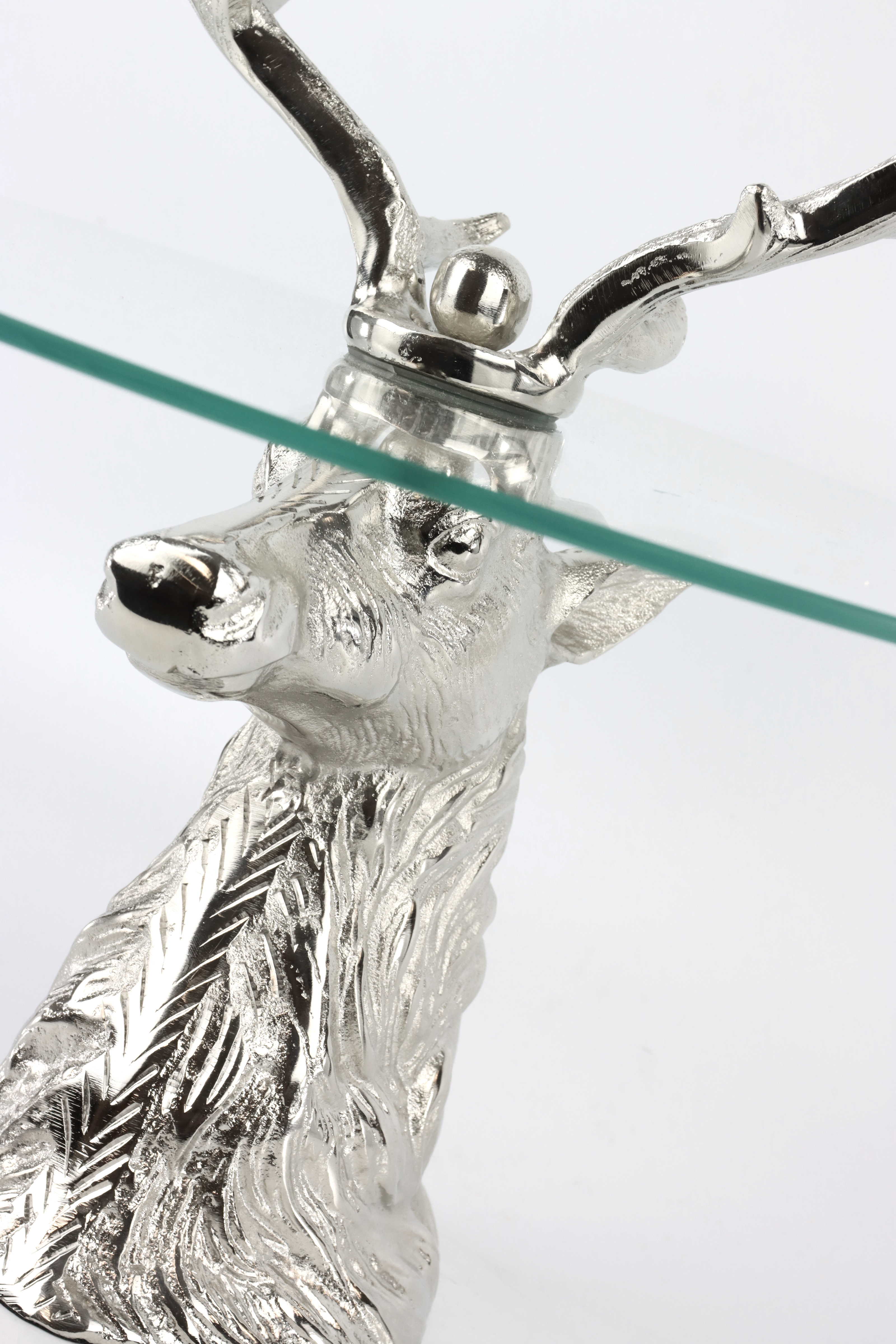Die Pokalplatte "Hirsch" ist aus vernickeltem Aluminium gefertigt und zeichnet sich durch sein silberfarbenes Finish und seine hochwertige Glasplatte aus. Die Platte misst etwa 45 cm, was sie groß genug macht, um ganze Käseplatten oder kunstvolle Dessertarrangements zu präsentieren. Auch als Deko-Element ist diese Pokalplatte ein garantiertes Highlight, indem sie stilvoll Kerzen, Dekokugeln oder Pflanzen in Szene setzt.