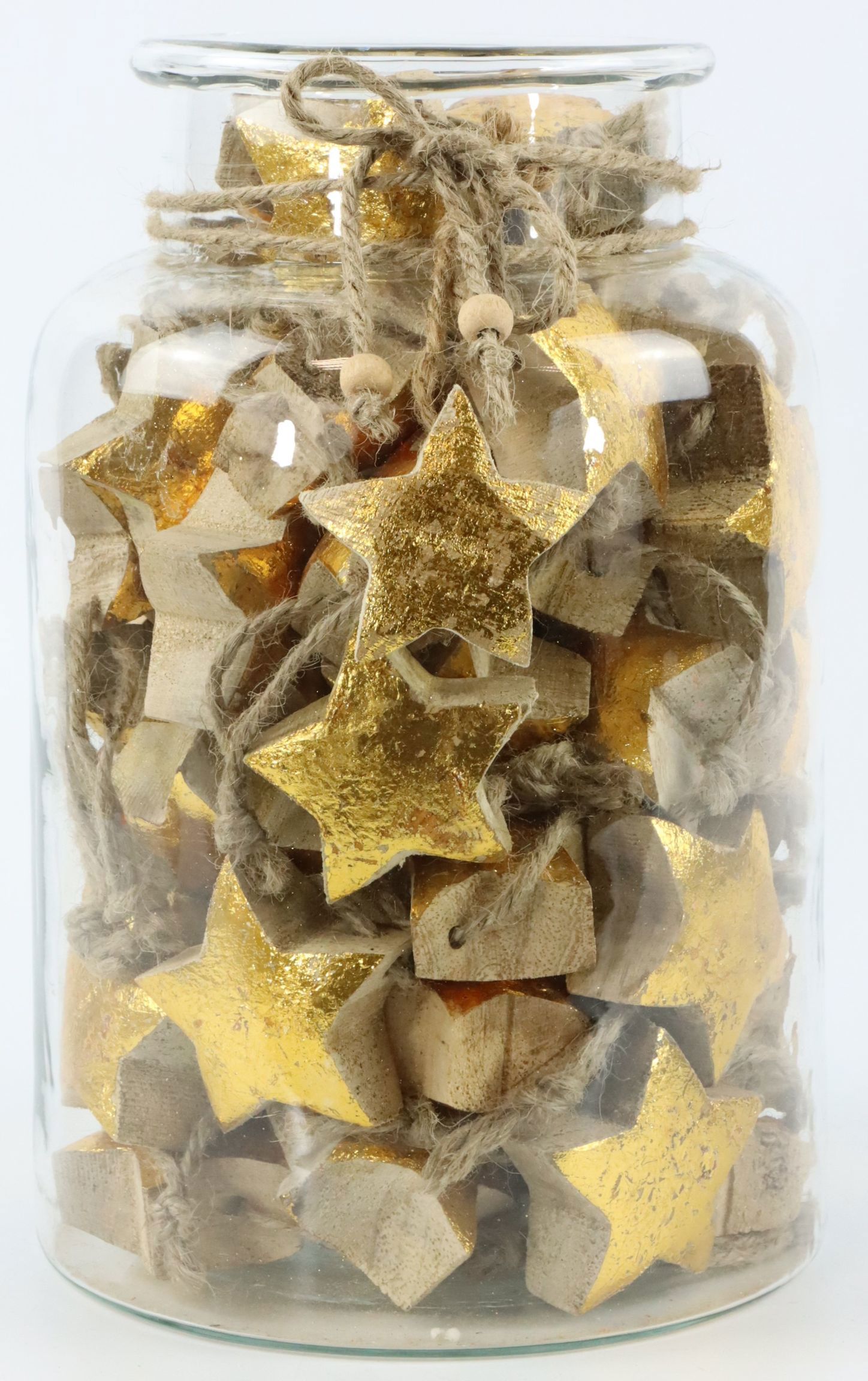 Unsere Sternanhänger sind aus hochwertigem Mangoholz gefertigt und in schimmerndem Goldton lackiert, welche eine besondere Qualität versprechen. Mit einer Größe von ca. 5 cm sind sie der perfekte Hingucker und strahlen dabei eine dezente Eleganz aus. Sie schmücken den Weihnachtsbaum, dienen als Tischdekoration oder werden an Zweigen und Fenstern drapiert. Gleichzeitig setzt das ca. 26 cm große Glas, in das sie eingefüllt sind, sie ideal in Szene und dient selbst als stilvolles Deko-Element.