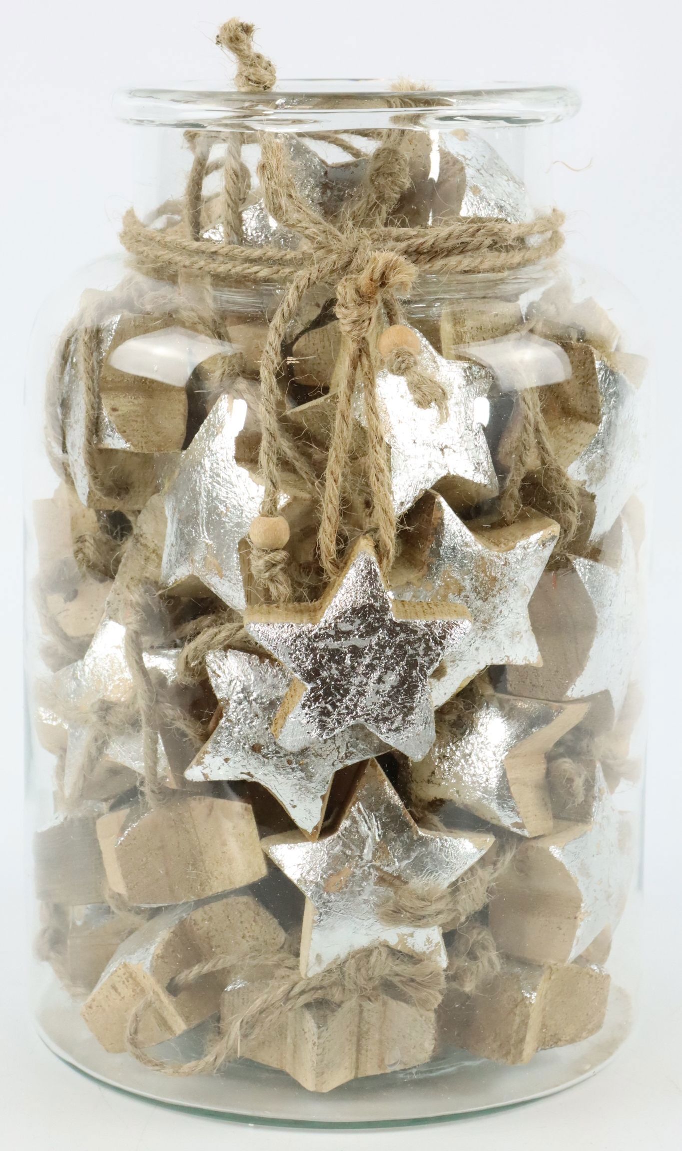 Das Set besteht aus 61 silberfarbenen Sternen, die aus hochwertigem Mangoholz gefertigt und ungefähr 5 cm groß sind. Die Sterne kommen in einem ansprechenden Glas, das etwa 26 cm hoch ist und als die perfekte Schauvitrine für diese zierlichen Schönheiten dient. Jeder Stern ist sorgfältig gefertigt, um Eleganz und Exzellenz zu gewährleisten. Sie sind robust genug, um mehrere Saisons zu überdauern, aber auch leicht genug, um an Weihnachtsbäumen, Kränzen, Fenstern und anderen Dekorationsflächen aufgehängt zu werden.