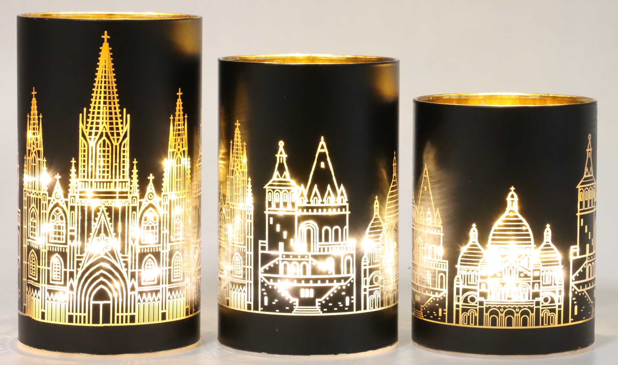 Vertreiben Sie das Dunkel in dieser Weihnachtszeit mit dem LED-Lichter-Set "City". Mit der Artikelnummer 5431 bieten wir Ihnen ein künstlerisch gestaltetes Set aus drei LED-Windlichtern mit städtischem Motiv an.