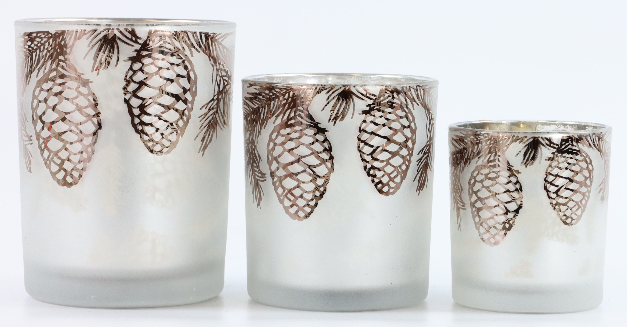 Mit dem exklusiven Set an Windlichtern "Pine" Artikelnummer 6143 tauchen Sie Ihre vier Wände in eine wohlige und festliche Atmosphäre. Bestehend aus drei ästhetischen und hochwertigen Glaswindlichtern in den schönen Größen 12,5 cm, 10 cm und 8 cm, verleihen diese Wohnaccessoires jedem Raum eine einladende und festliche Atmosphäre, besonders passend in der stimmungsvollen Weihnachtszeit.