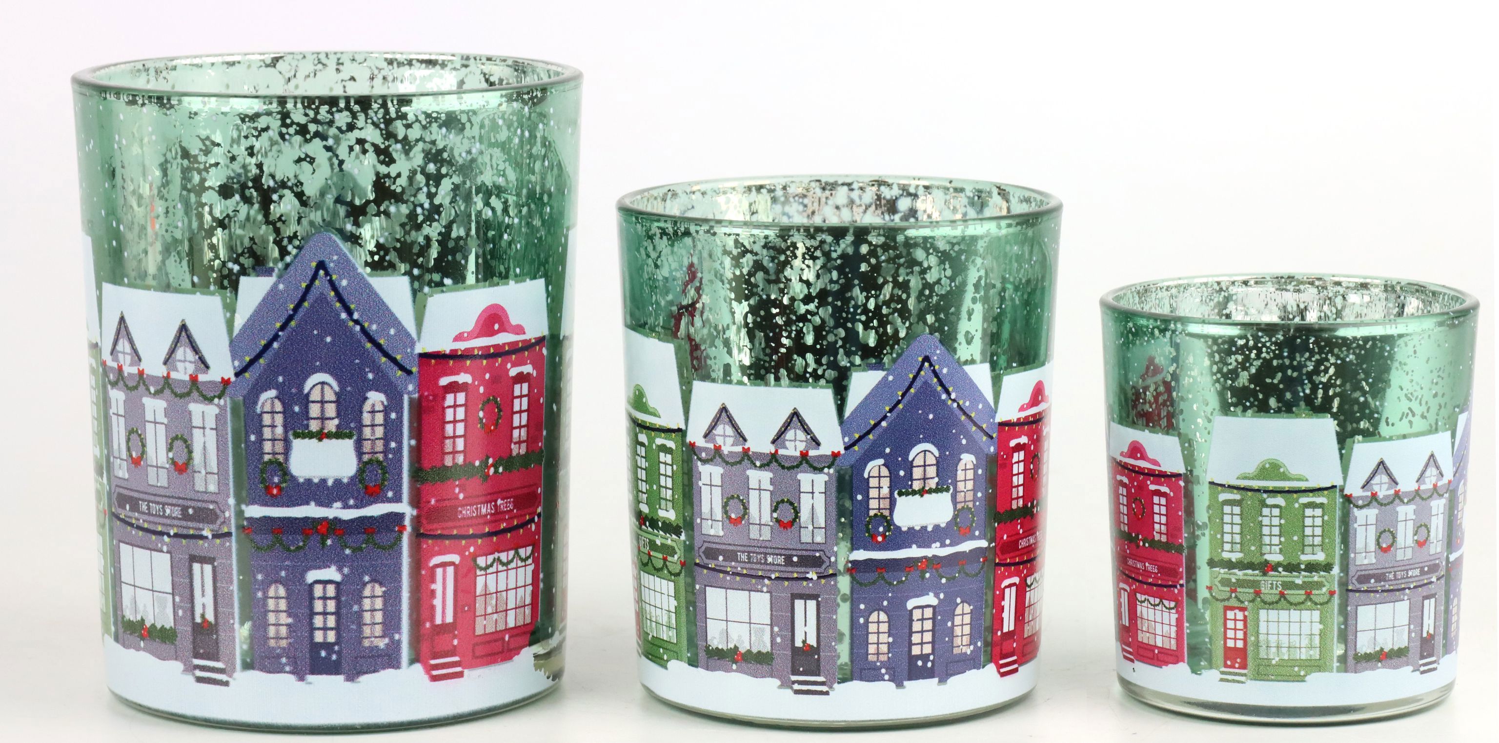 Die Windlichter sind in einem ansprechenden grünen Farbton gehalten, der sowohl im Licht der Lichterketten als auch im natürlichen Tageslicht erstrahlt. In jeder der drei unterschiedlichen Größen und Formen erzählen die Häusermotive eine eigene Geschichte und ziehen die Blicke Ihrer Kunden magisch an. Ob als Tischdekoration oder in einer Fensterbank platziert, die Windlichter bieten ein beruhigendes, warmes Licht, welches das winterliche Ambiente unterstreicht.