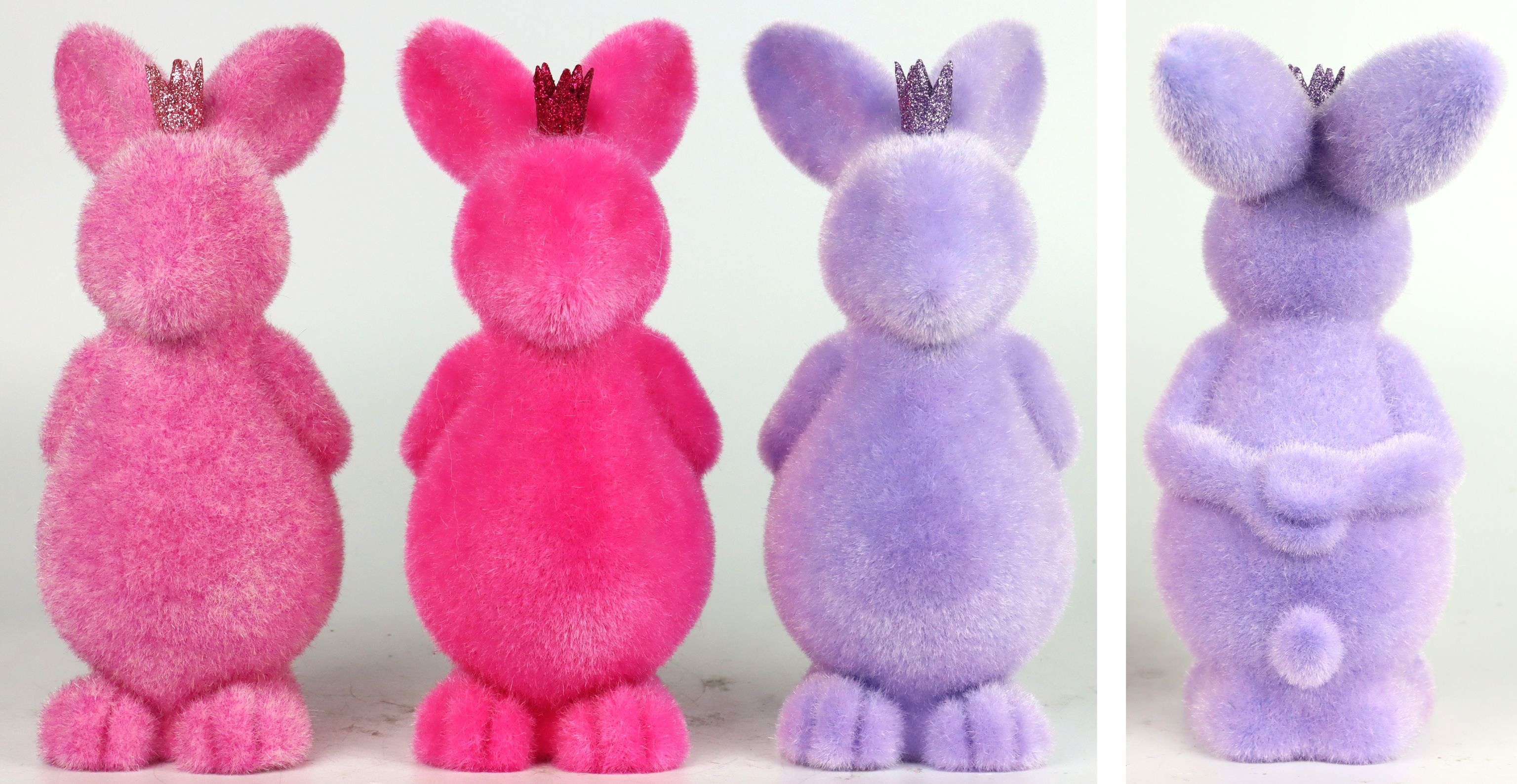 Entdecken Sie das bezaubernde 3-teilige Hasenset "HASEN FLOCAGE" für Ostern - ein stilvolles Accessoire für den stationären Einzelhandel im Bereich Wohnen und Lifestyle. Dieses charmante Hasenset, bestehend aus drei kunstvoll gefertigten Hasenfiguren in lebendigen Pink- und Lilatönen, ist der perfekte Hingucker für Ihre Frühlings- und Osterkollektion. Hergestellt aus hochwertigem Kunststoff, überzeugen die Hasen mit einer feinen Flocage-Oberfläche, die ihrem Look eine samtige Textur verleiht. Mit einer Höhe von ca. 23 cm sind die Hasen ideal, um farbenfrohe und einladende Dekorationen in Schaufenstern, Verkaufsregalen oder auf Theken zu gestalten.