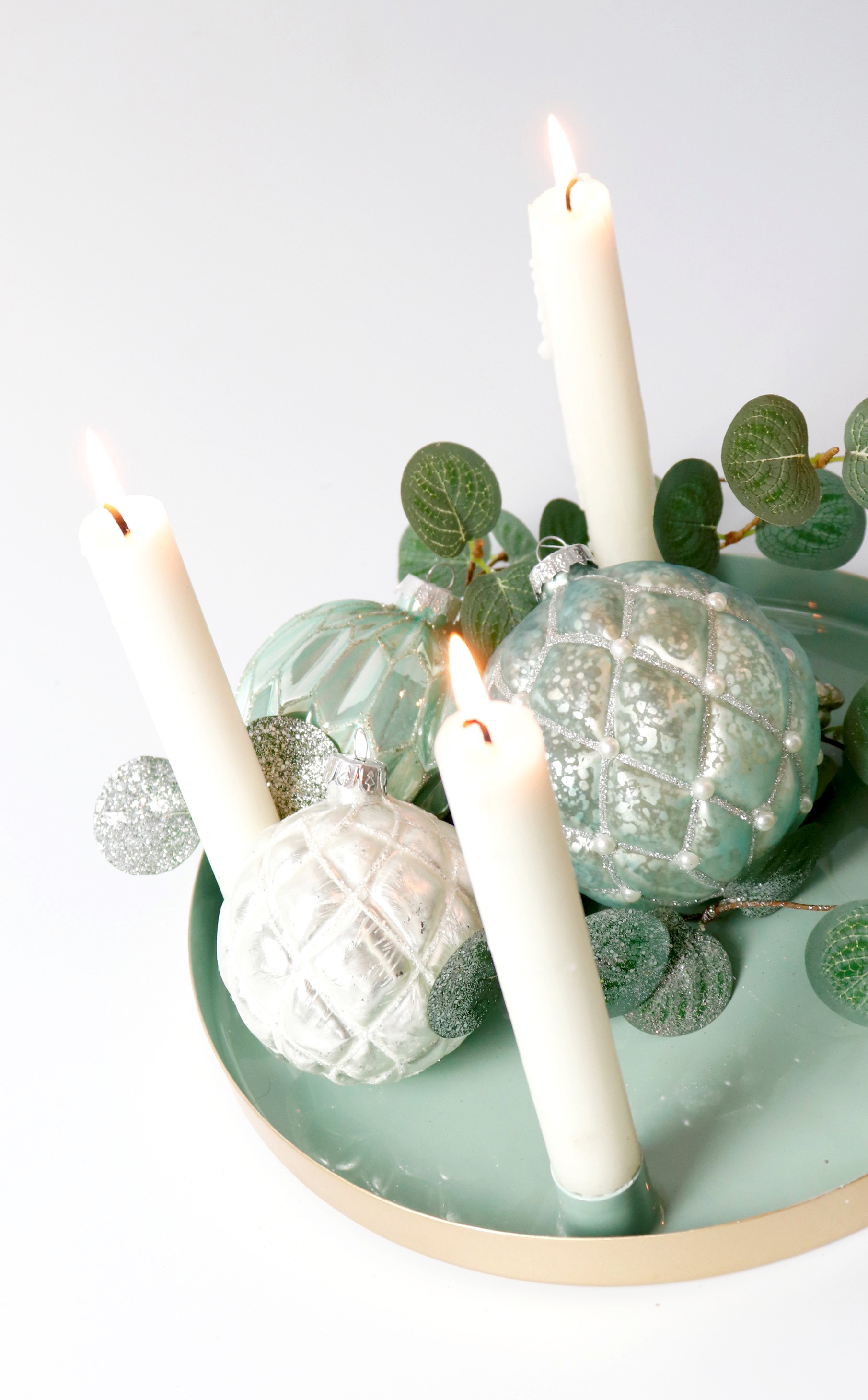Our "Deluxe" candle bowls (item number: 7999) consist of two candle bowls in the charming colour mint. The bowls are made of high-quality metal, which not only makes them robust and durable, but also a real eye-catcher on any glass table or sideboard. They have a diameter of 25 cm and 20 cm, which makes them perfect for four stick candles and guarantees an elegant and stylish look.