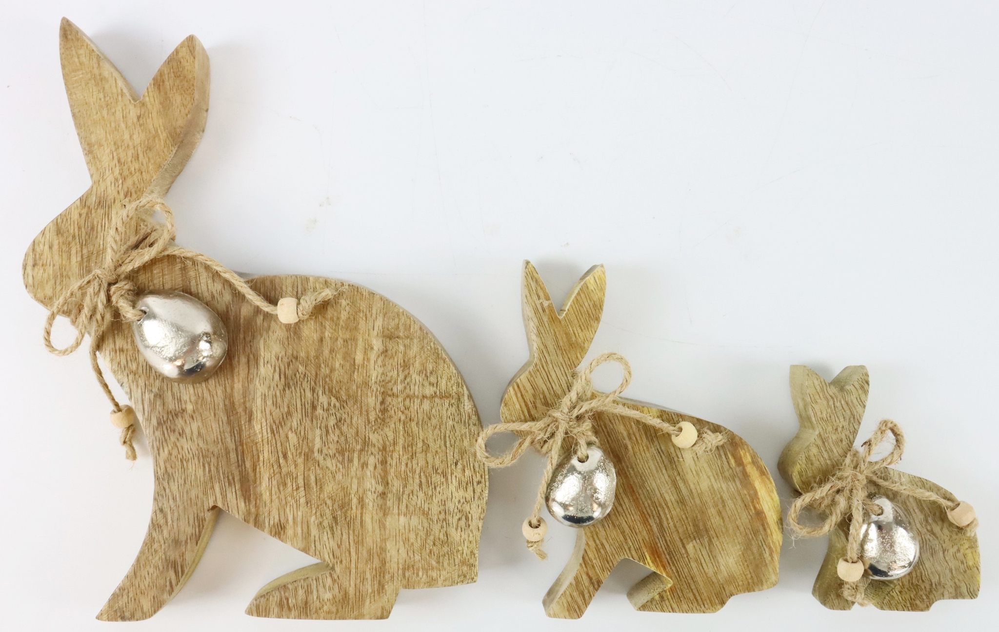Discover the charming WOODEN BUNNY "TRIO" S/3 made of high-quality mango wood, which will give your Easter shop a special rustic charm. This decorative set consists of three individually designed bunny figures measuring 24 cm, 15 cm and 10 cm. The natural colour of the mango wood emphasises the aesthetics and blends wonderfully into any homely ambience, whether for stationary retail in the home and lifestyle sector or for special Easter presentations.