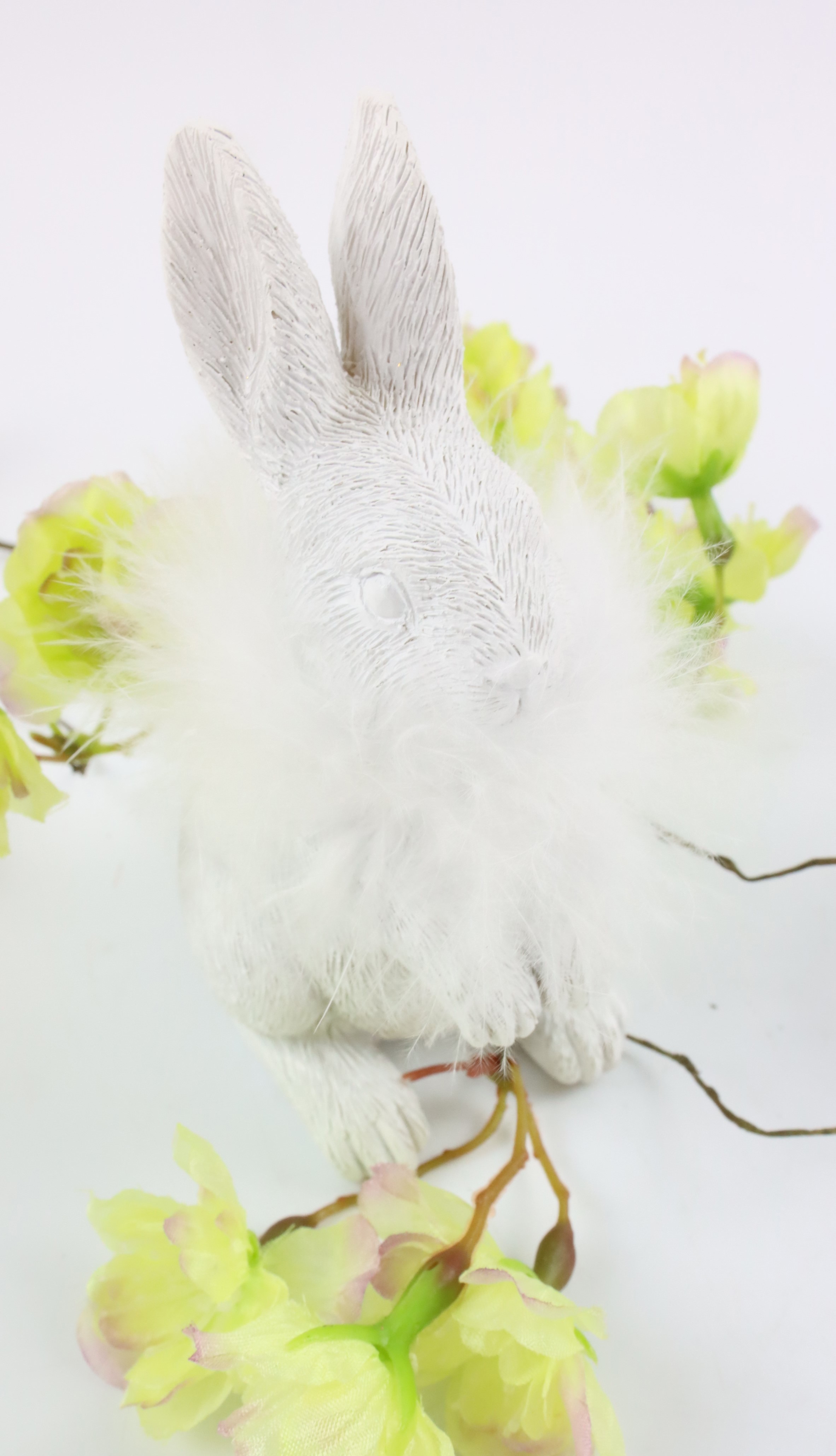Both bunnies in the set are an elegant white colour and feature delicate feathers, giving them a unique, feather-light appearance. The figures are approx. 12 cm and 10 cm high and harmonise perfectly with each other to create an aesthetic balance in the decoration. This duo is ideal for subtly bringing the lightness and freshness of spring into your business premises.