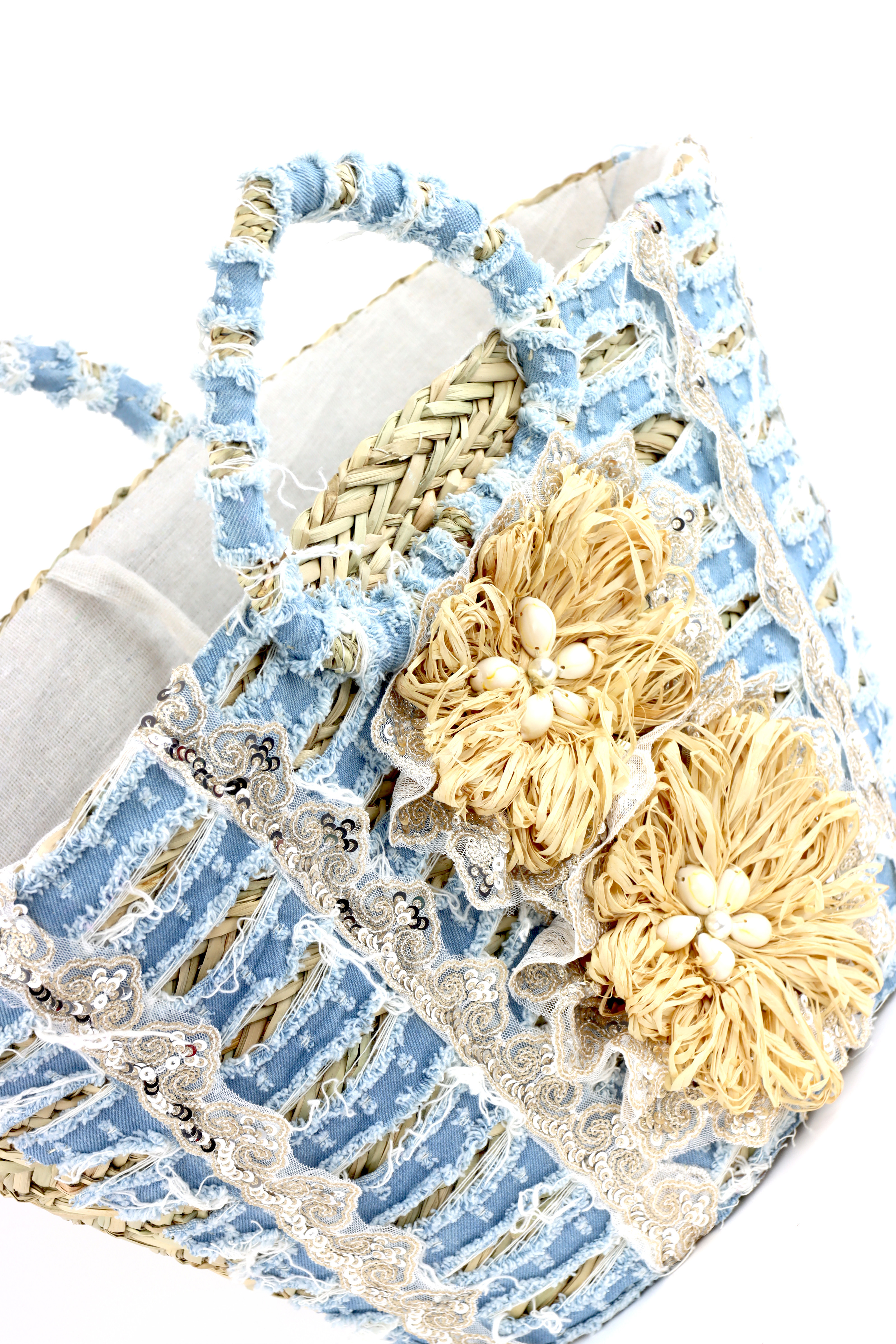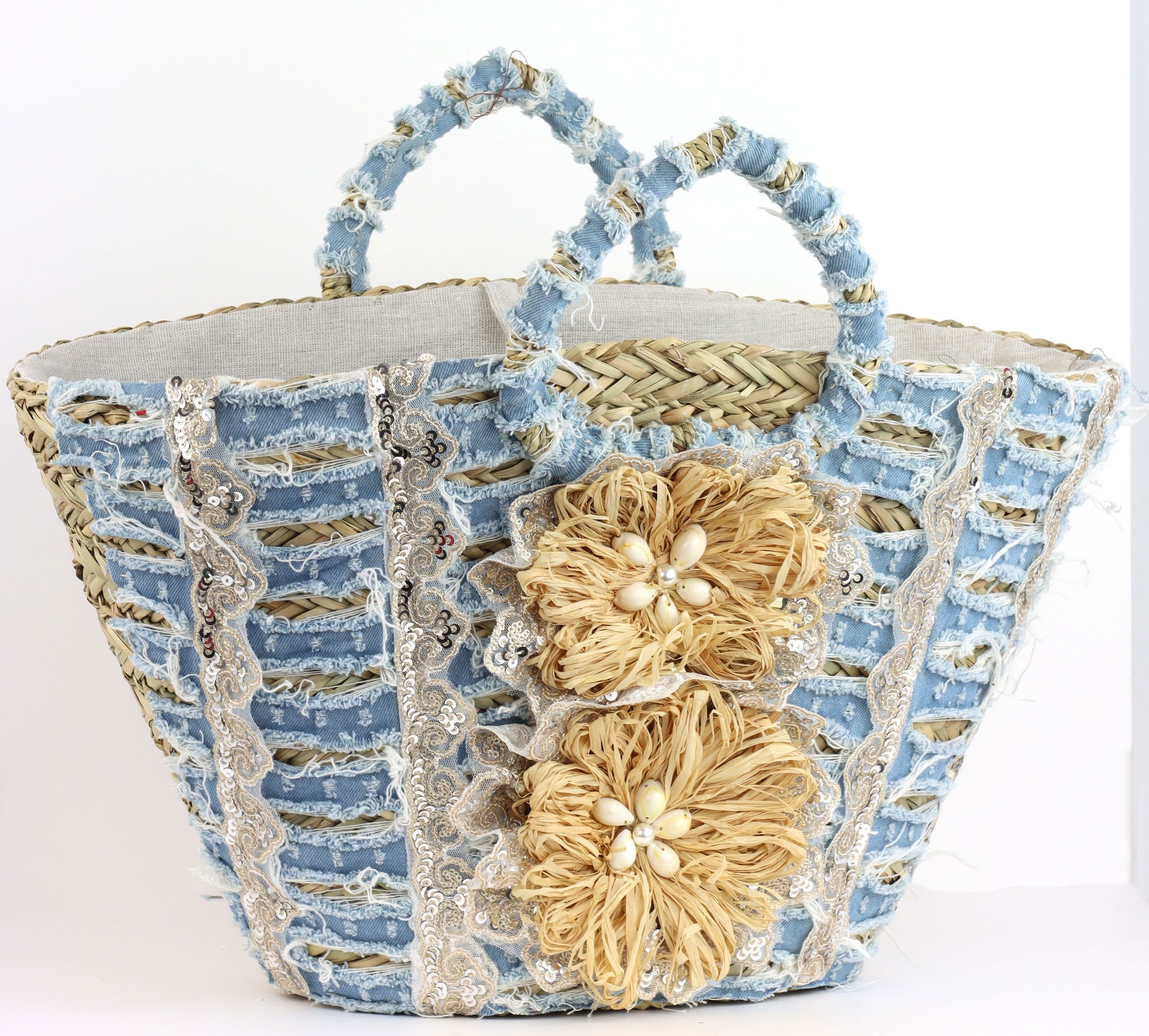 El bolso cesta "Denim Diva" impresiona por su acertada combinación de elementos naturales y modernos. La robusta hierba marina forma la base del bolso y garantiza una excelente estabilidad. Los sofisticados detalles en tejido vaquero le confieren un aspecto contemporáneo y lo hacen versátil y fácil de combinar con distintos atuendos. Los apliques decorativos de flores de rafia añaden toques de color y convierten el bolso en un reclamo único.