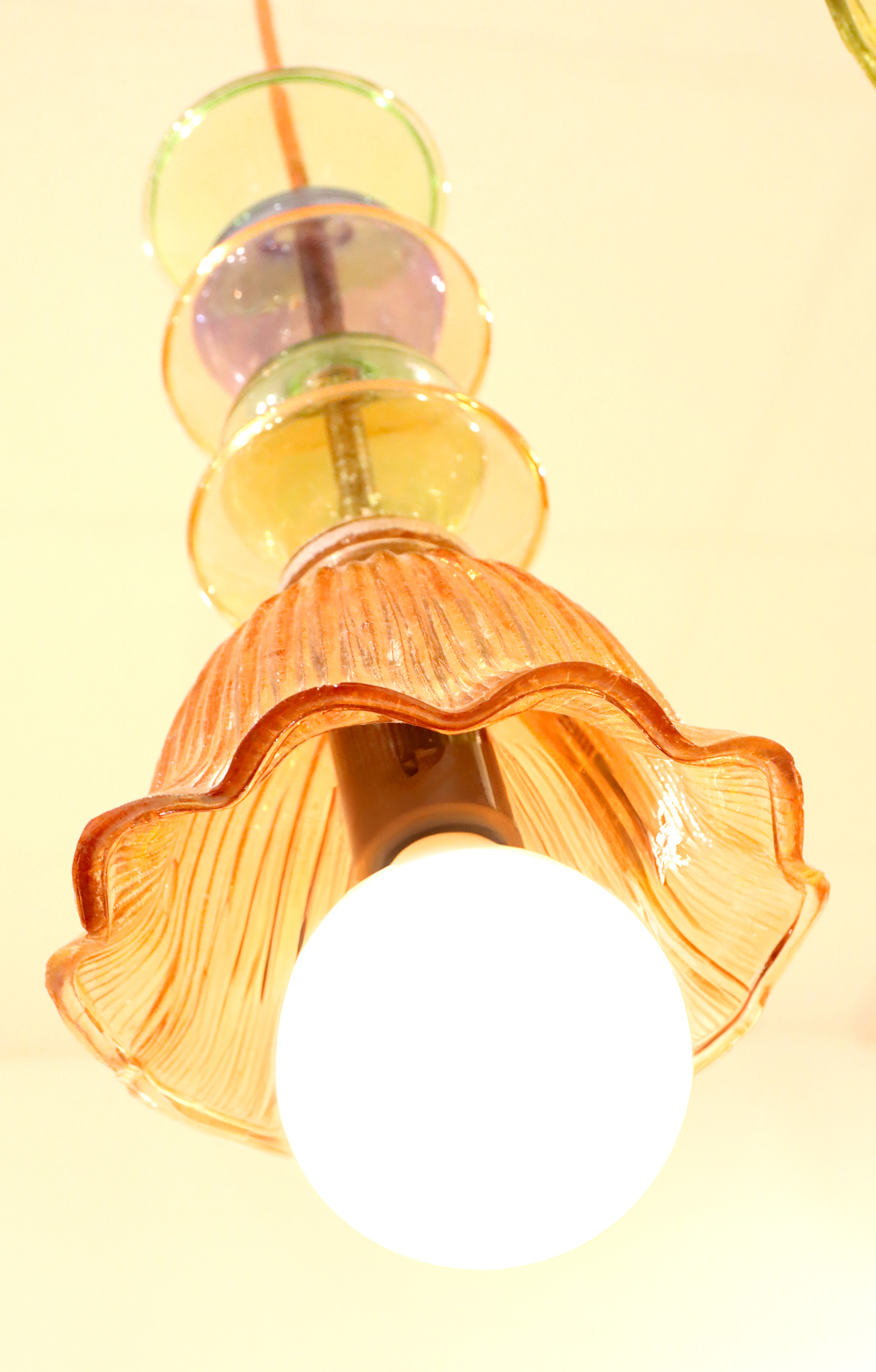 La lámpara colgante "JEU DE LUMIÈRE" es una obra de arte de cristal y metal que combina a la perfección diseño y funcionalidad. La pantalla de color naranja brillante atrae todas las miradas y se integra a la perfección en interiores modernos. La variada gama de colores y el fino material de vidrio confieren a esta lámpara un encanto único que hará las delicias de sus clientes.