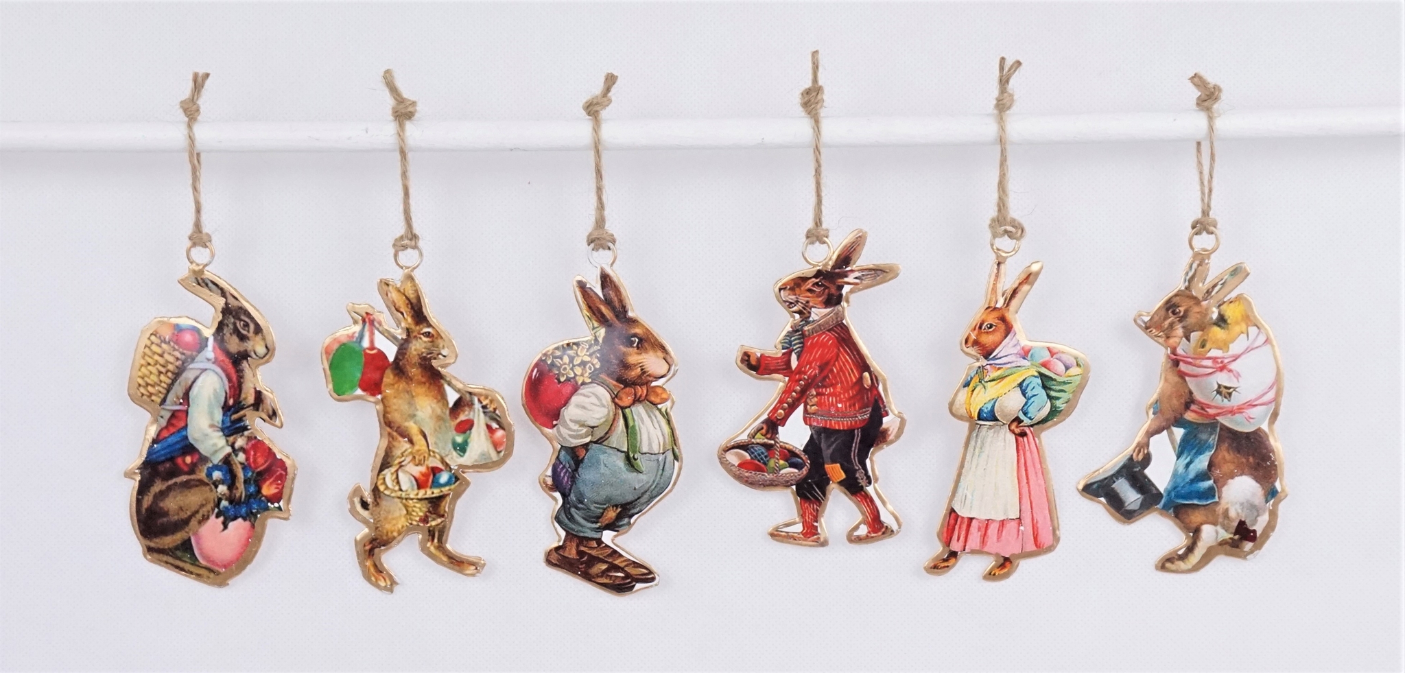 - Juego de seis piezas**: Perchas decorativas con adorables motivos de conejitos.