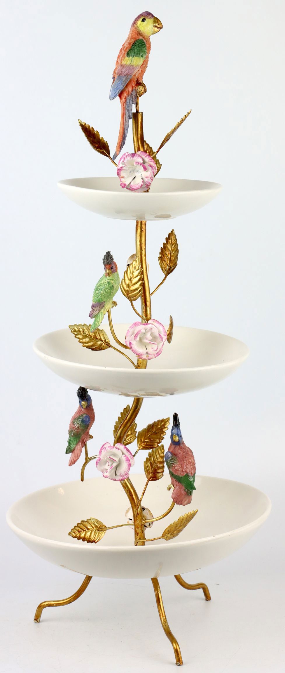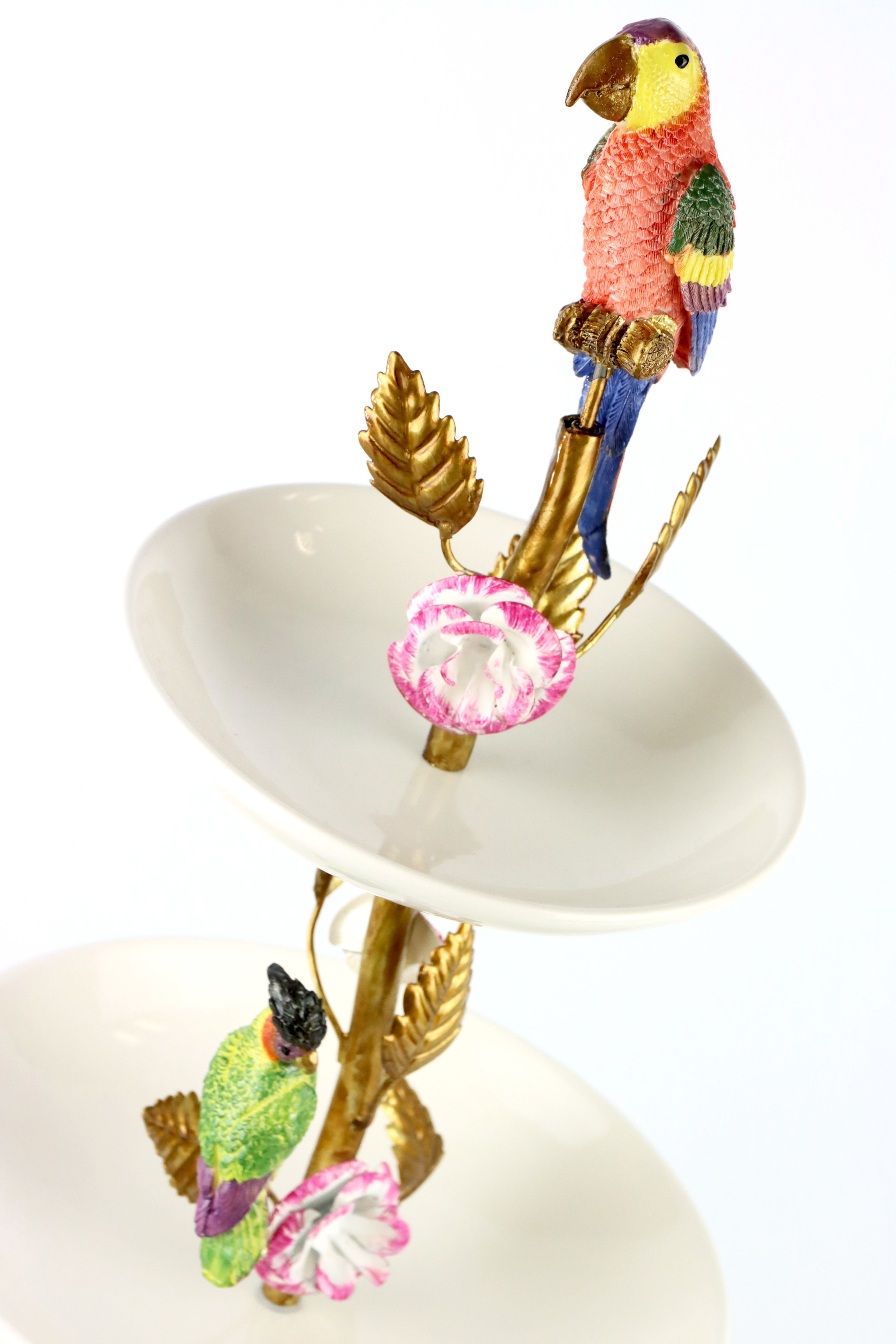 El ornamentado motivo de ave del paraíso atrae inmediatamente las miradas y confiere a la pizarra un encanto único. Cada ave está diseñada con gran detalle y refleja la elegancia natural de los animales exóticos. La combinación de cerámica y metal no sólo crea una interesante mezcla de materiales, sino que también proporciona la estabilidad y durabilidad necesarias. Este etagere no es sólo decorativo, sino también una pieza funcional para cualquier invitación que sus clientes sabrán apreciar.