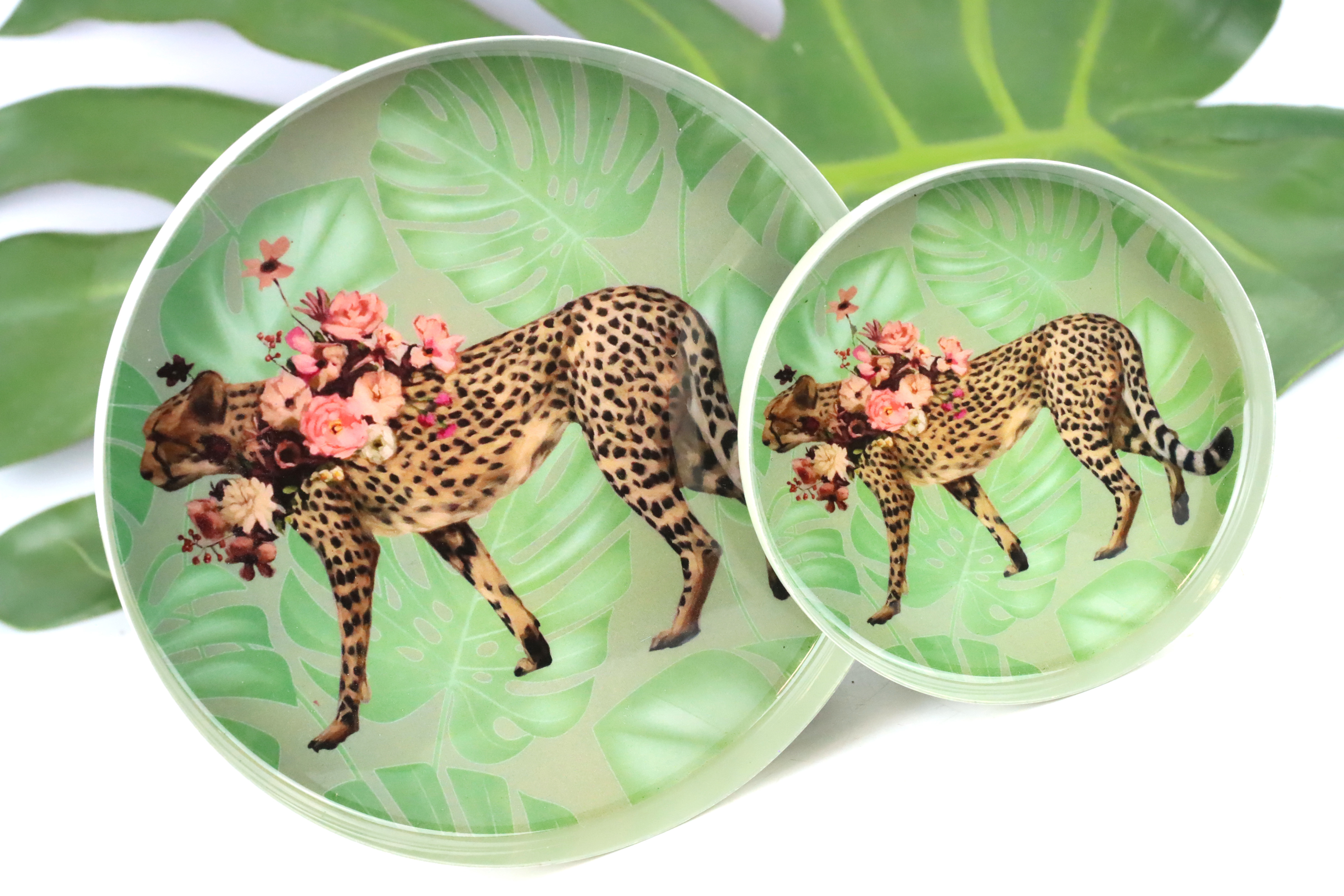 Le motif léopard avec une chaîne de fleurs aux couleurs vives sur la surface confère à ces plateaux un look unique. Parfait pour des thèmes comme l'exotisme, le safari ou l'élégance botanique, ce design est un must absolu ! La représentation détaillée des motifs donne un aspect vivant qui ne manquera pas de séduire vos clients.