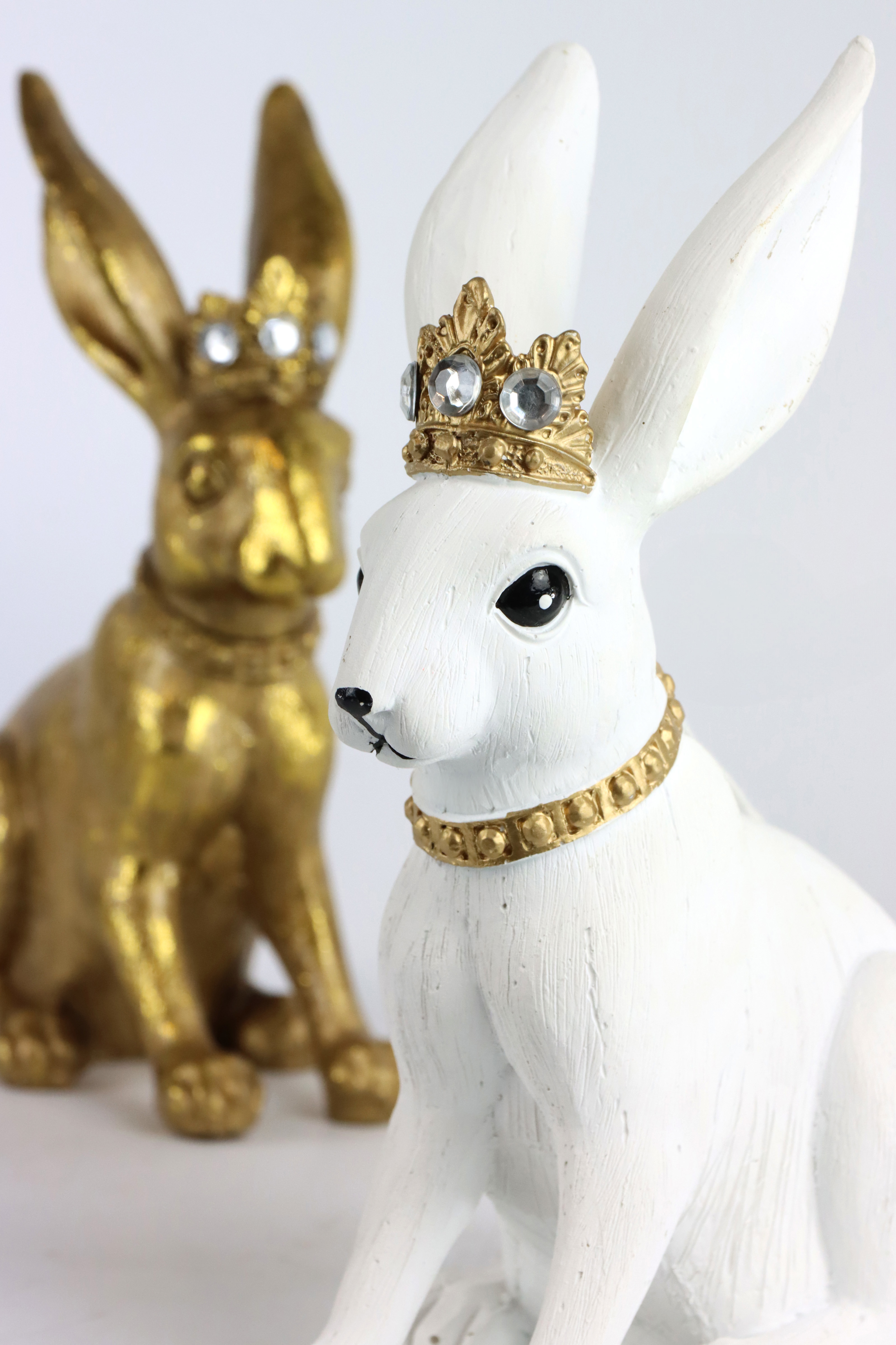 - **Set de décoration de Pâques exclusif:** Composé de deux majestueuses reines des lapins en or et blanc.